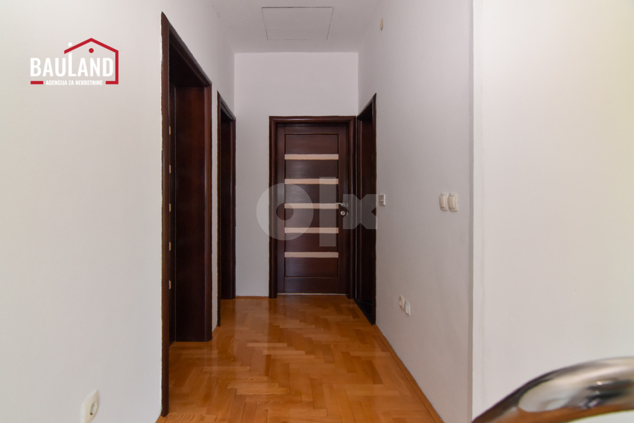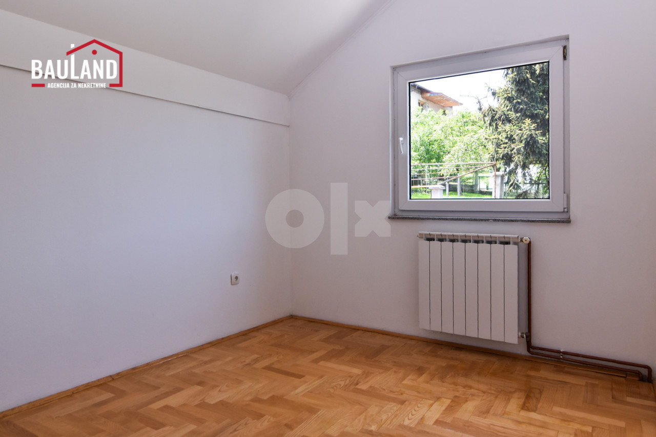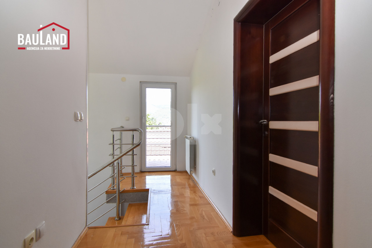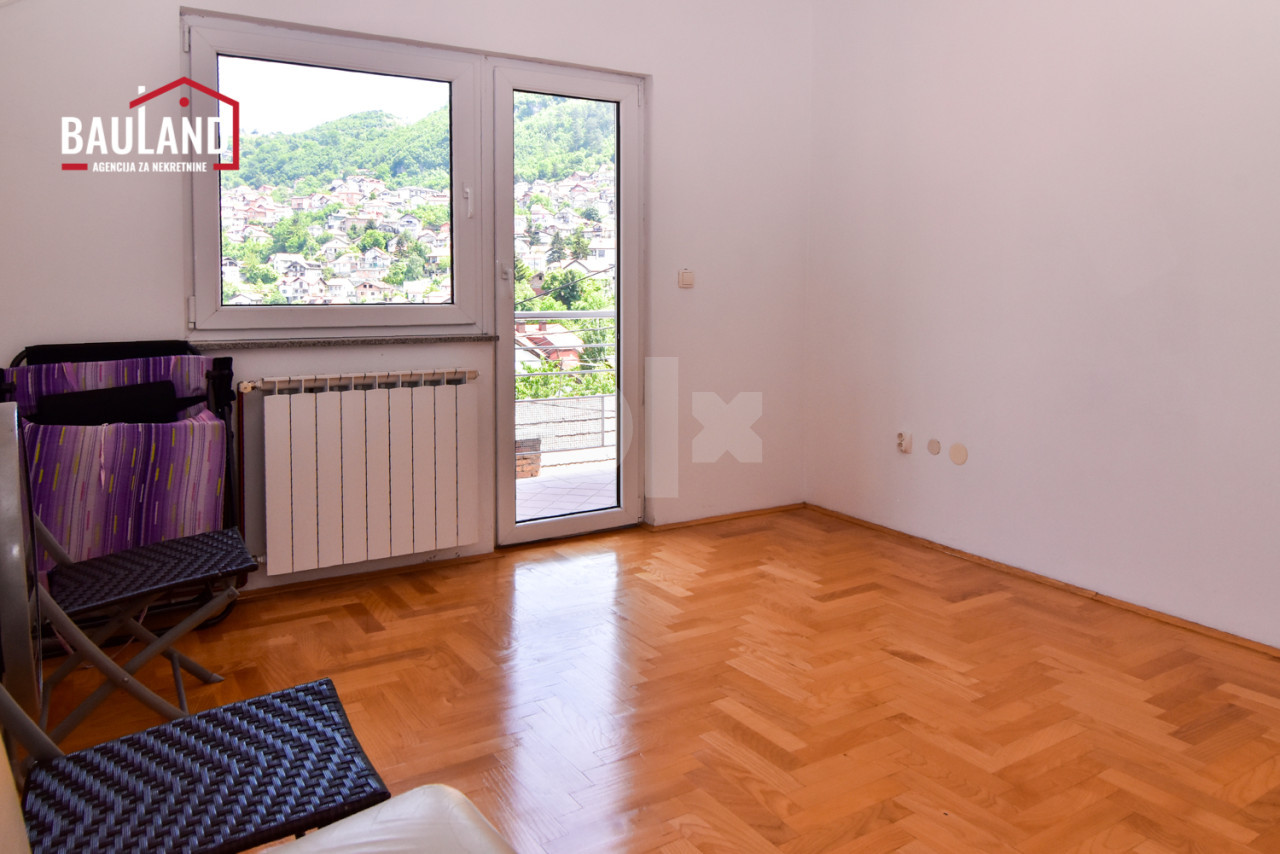 BAULAND izdaje trospratnu kuću površine od otprilike 200 m², s okućnicom od 800 m², smještenu u ulici Mujkanovića, Općina Stari Grad. Kuća se sastoji od tri etaže, s garažom u suterenu te prvim spratom i potkrovljem koji su povezani unutrašnjim stepeništem. Prizemlje obuhvaća prostrani dnevni boravak s velikim staklenim vratima, kuhinju, trpezariju i kuptilo. Potkrovlje se sastoji od tri spavaće sobe, kupatila i terase s predivnim pogledom na grad Sarajevo.