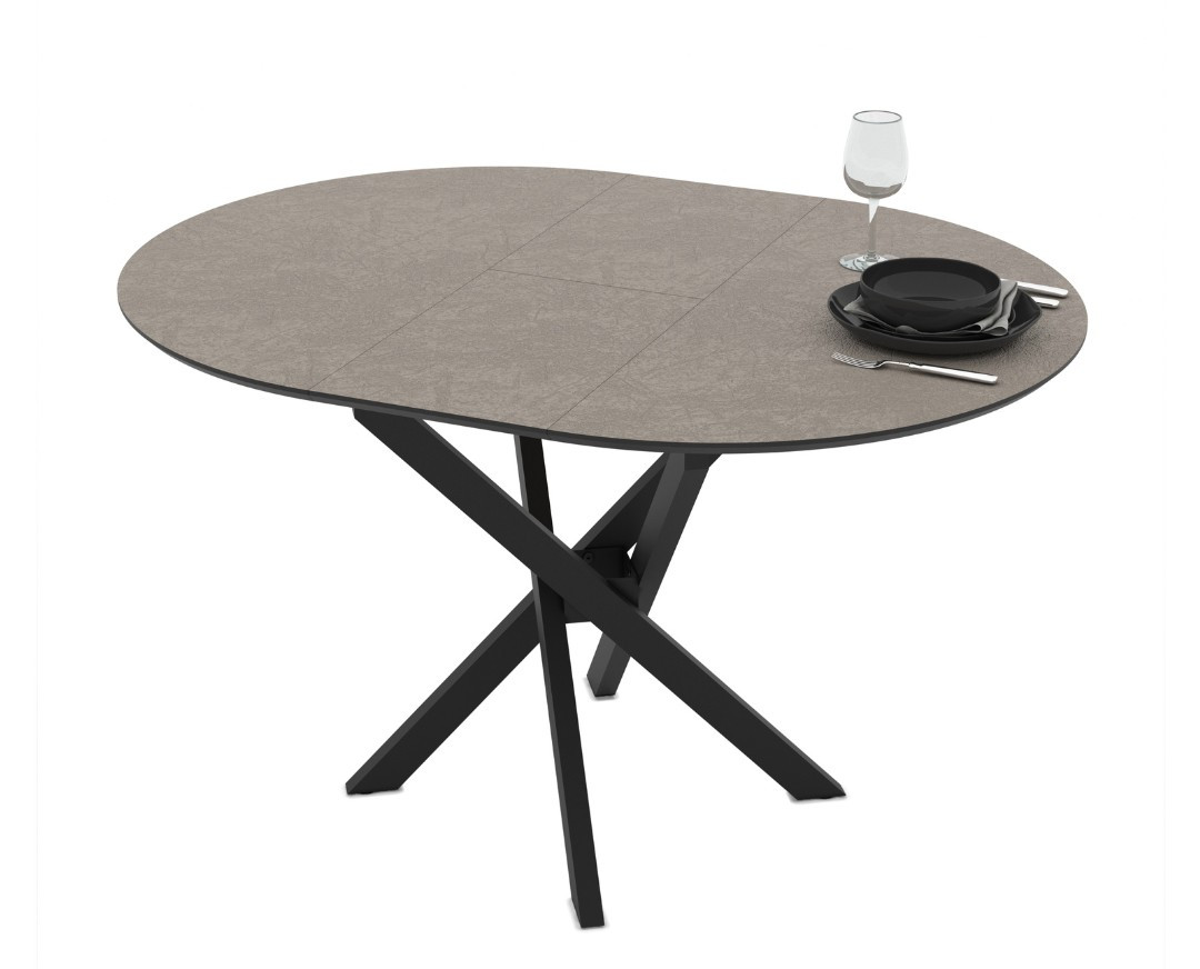Sto Ruta odiše savremenim industrijskim šarmom zahvaljujući kombinaciji crne metalne baze i ploče u Lagun dezenu.