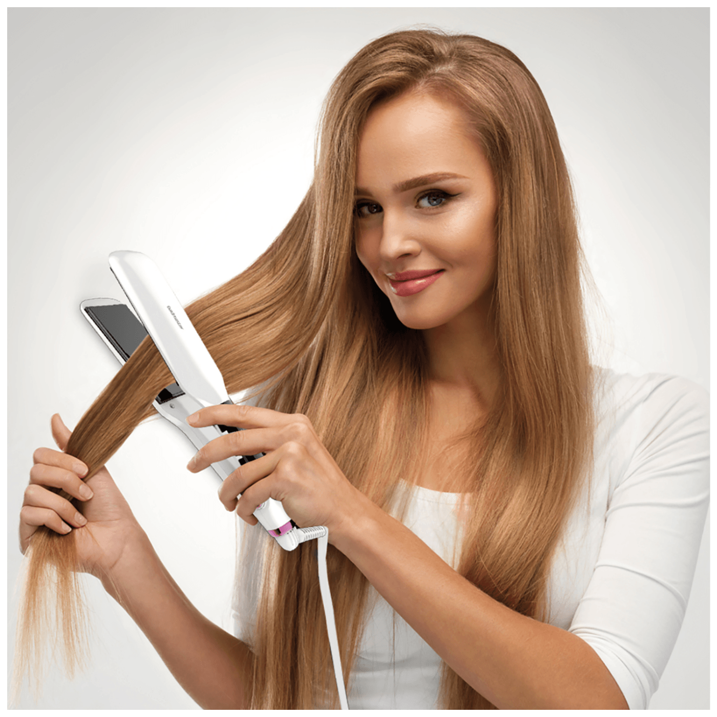 Pegla za kosu, snaga 80W, keramičke ploče obložene keratinom, digitalni LCD zaslon, tipke na dodir za kontrolu temperature i snage, postavke temperature 150 - 230 °C, dimenzije ploče 110 x 50 mm, automatsko isključivanje nakon 1 sata, putna brava, okretni kabel za 360°, elegantan dizajn, kabel za napajanje 1.8 met.