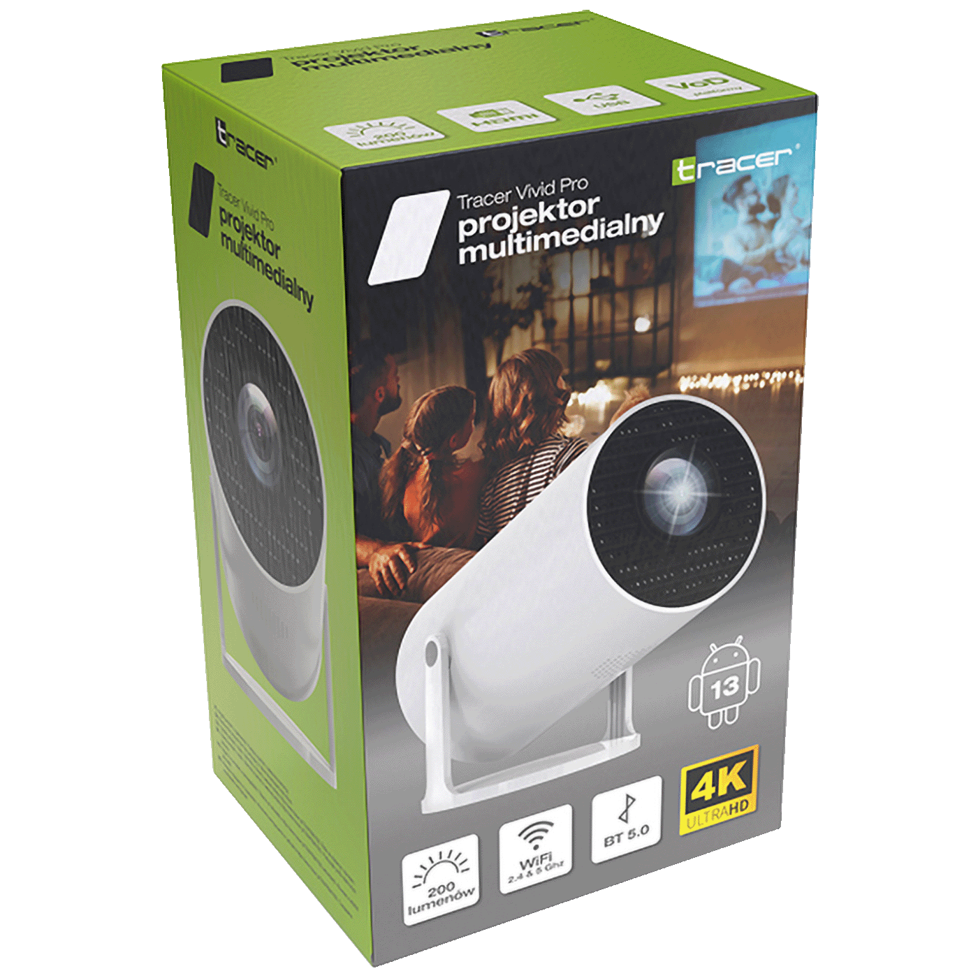 Tracer Vivid Pro je kompaktan projektor s operativnim sistemom Android 13 koji otvara nove mogućnosti kućne zabave. Zahvaljujući podršci za streaming aplikacije i širokom rasponu funkcija, možete gledati filmove, serije ili igrati igre na velikom ekranu – bez potrebe za dodatnim uređajima.