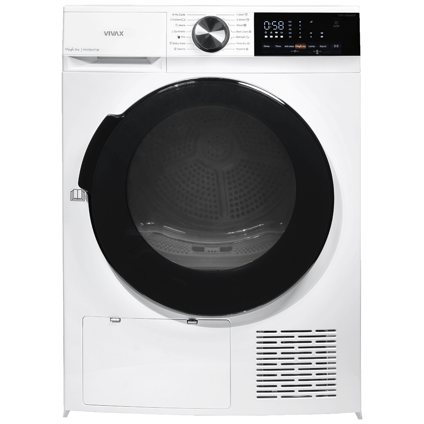 Vivax CDR-0816MHP je moderna sušilica rublja s toplotnom pumpom koja nudi učinkovitost, nježno sušenje i veliki kapacitet. Idealan je izbor za domaćinstva koja žele kvalitetno sušenje bez previsoke potrošnje energije.