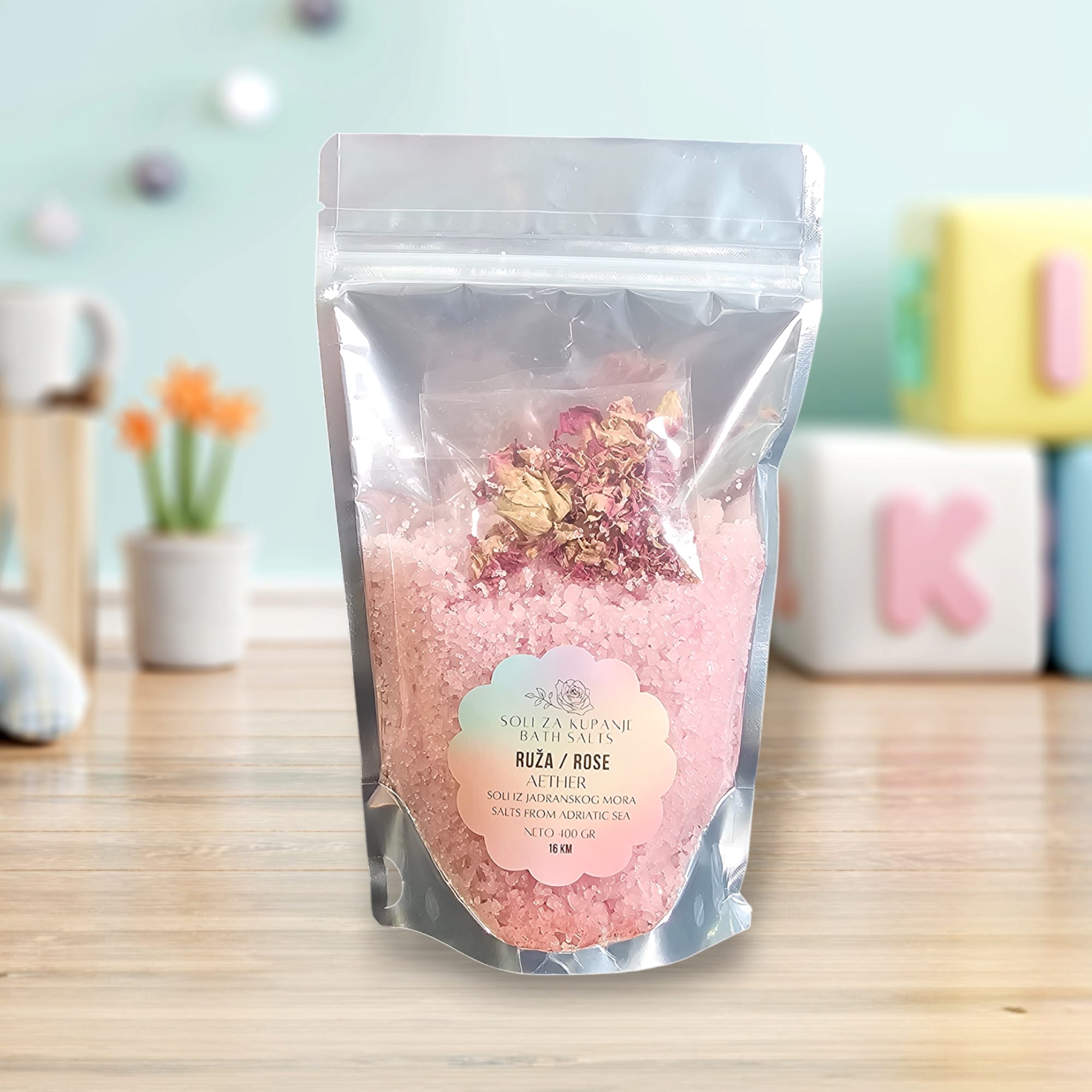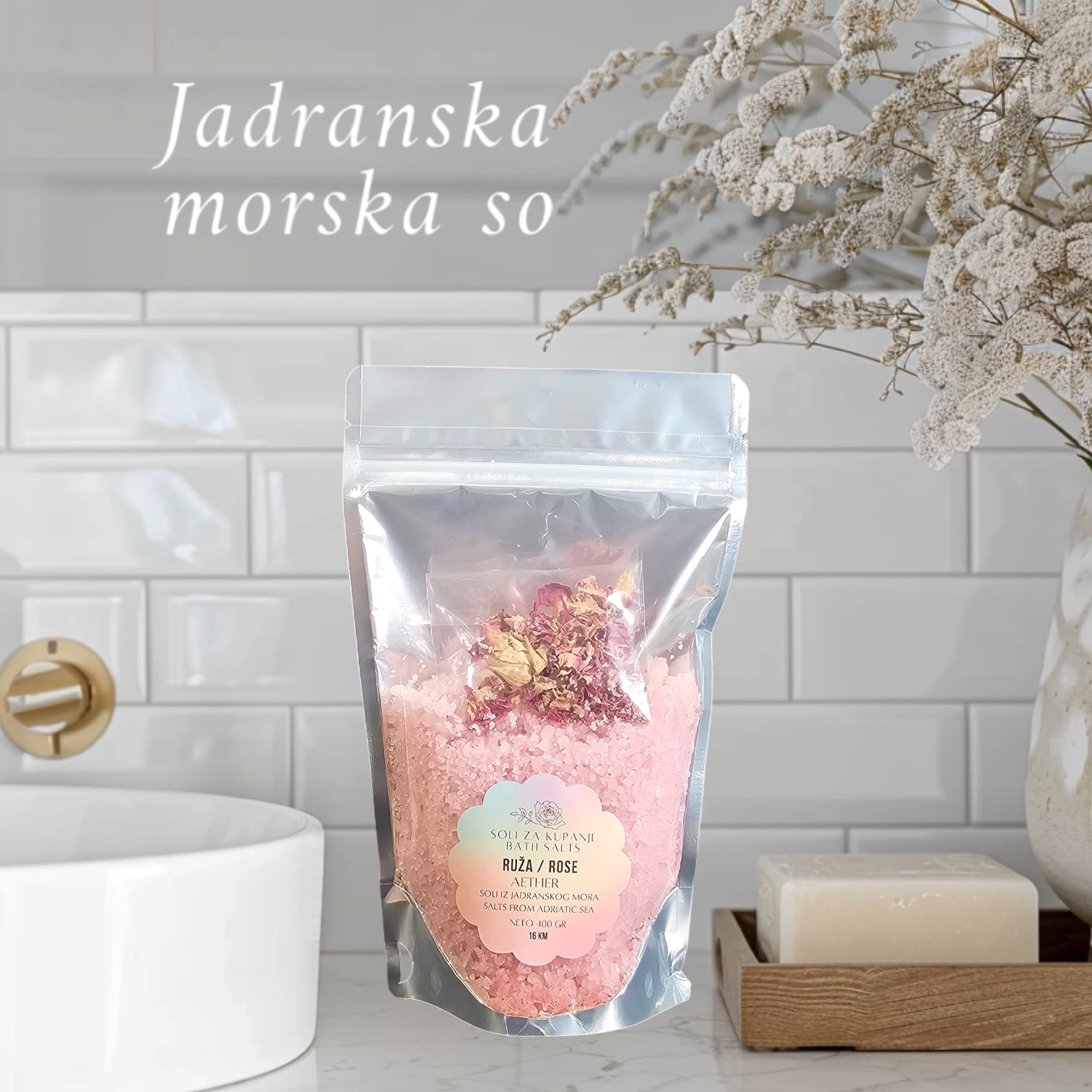 Doživite luksuznu njegu i romantičnu atmosferu u svakom trenutku s našom kupkom s morskom soli i laticama ruže.