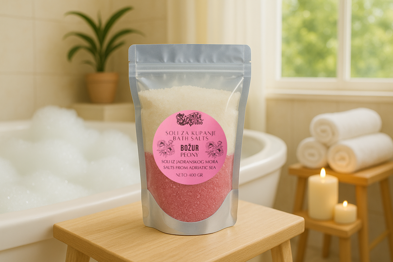 Opustite se uz luksuznu njegu tijela sa našom mirisnom solju za kupanje. Morska sol iz Stona – najstarija aktivna solana u Europi, čija tradicija seže još u rimsko doba. Stonska sol, poznata po svojoj čistoći i bogatstvu minerala, dobiva se prirodnim putem koristeći sunce, more i vjetar, bez upotrebe industrijskih procesa obogaćena našim mirisim uljima.