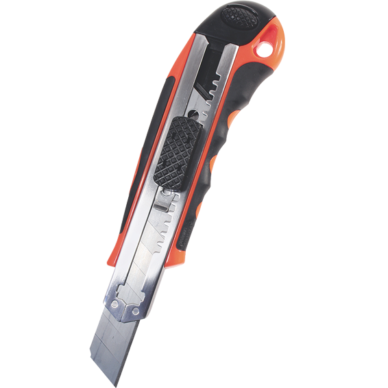 Skalpel, univerzalni, 18mm oštrica, Masivno plastično kućište sa gumenom drškom, metalno ležište, automatsko pričvršćenje i zamjena noža, 4 rezervna noža u dršci