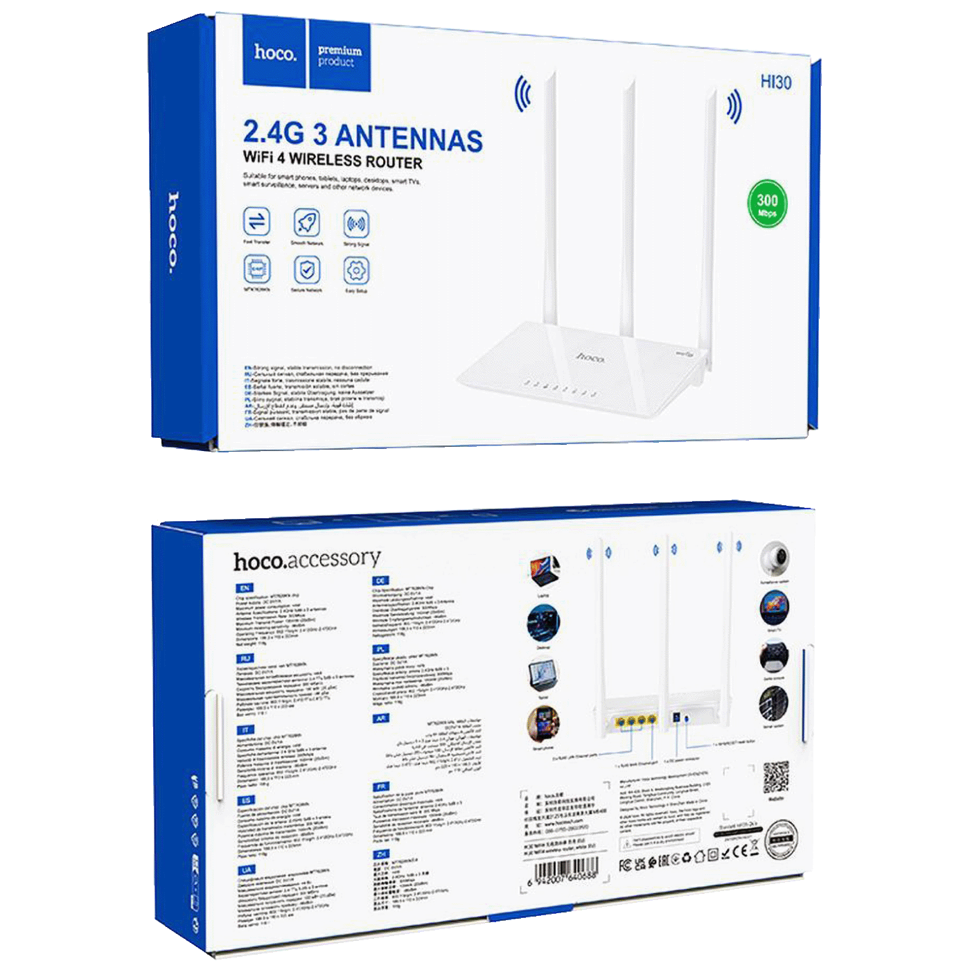 HOCO HI30 je pouzdan WiFi4 (802.11b/g/n) kompatibilan bežični router koji pruža brzu internetsku vezu do 300 Mbps.