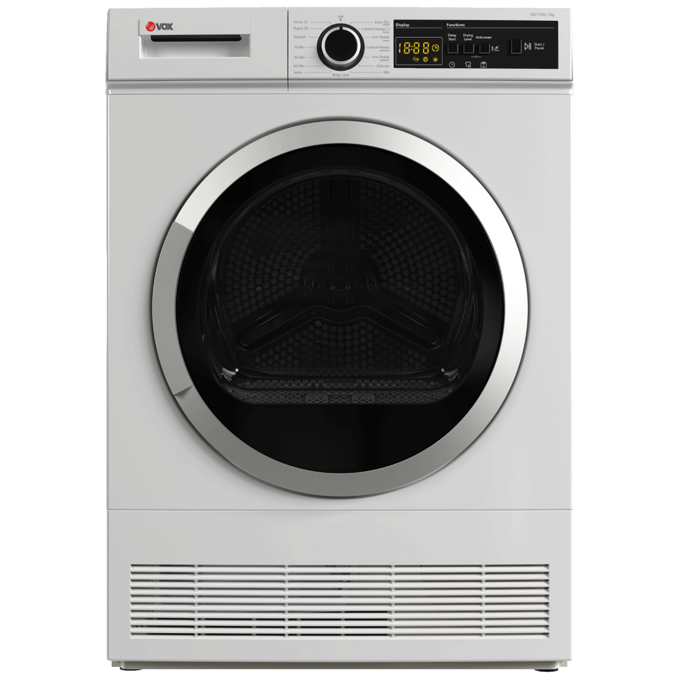 Vox TDC‑715G je samostojeća mašina za sušenje veša dizajnirana da brzo i efikasno ukloni vlagu iz rublja nakon pranja. Ovaj model koristi topli zrak za nježno sušenje bez oštećivanja tkanina i nudi više programa za različite vrste garderobe — od svakodnevnih majica i džempera do osjetljivijih tkanina. Upravljanje je jednostavno preko analognih dugmadi i LED indikatora, što omogućava lako podešavanje vremena sušenja prema količini i vrsti odjeće. Prozirna vrata olakšava praćenje procesa sušenja, dok unutrašnja bubanj rotacija i perforacije pomažu ravnomjernom sušenju bez nabora. Ovaj uređaj je praktičan izbor za domove bez prostora za prirodno sušenje ili u vlažnim uslovima.