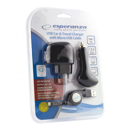 USB punjaci + microUSB kabl ESPERANZA, 3in1 set, DC 12-24V, AC 100-240V, out 5V/1000mA, EZ116