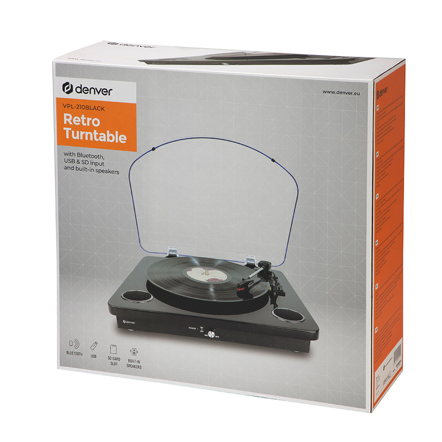 Denver gramofon VPL-210 BLACK, USB & SD card (play&record), bluetooth, zvučnik 5W, audio out, 331/3rpm, 45rpm or 78rpm