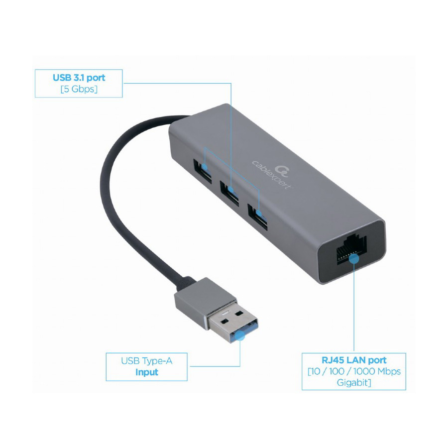 USB hub + GLAN Ethernet adapter 10/100/1000 USB A plug/RJ45, GEMBIRD A-AMU3-LAN-01
