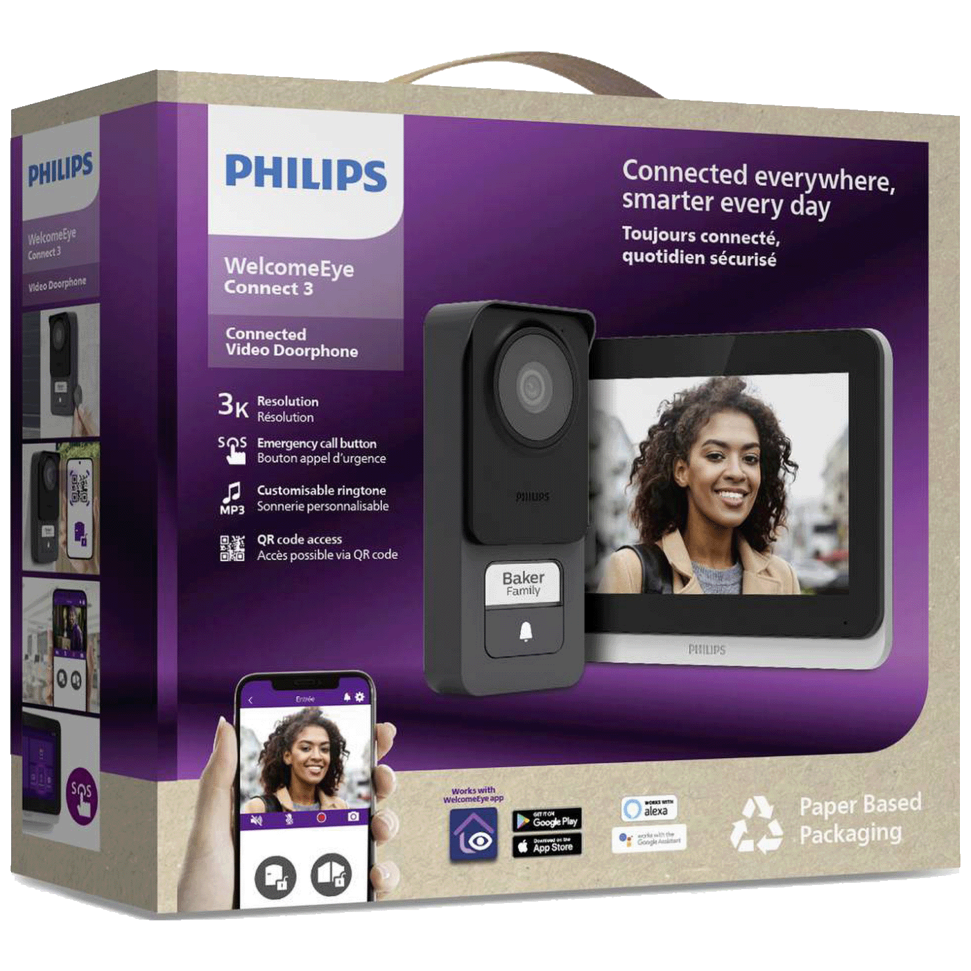 Potpuna kompatibilnost s glasovnim asistentima Google i Alexa: Vaš glasovni asistent upozorit će vas na posjetitelja, a vi možete koristiti svoj glas za otvaranje vrata pomoću koda po vašem izboru. Ako vaš glasovni asistent ima zaslon, možete vidjeti sliku dolaznog poziva uživo i razgovarati s posjetiteljem. Također je kompatibilan s Philips sigurnosnim kamerama (View & Look): prikažite sliku s kamera na zaslonu monitora i prebacite se na sliku s interfonskih ploča jednostavnim klikom.
