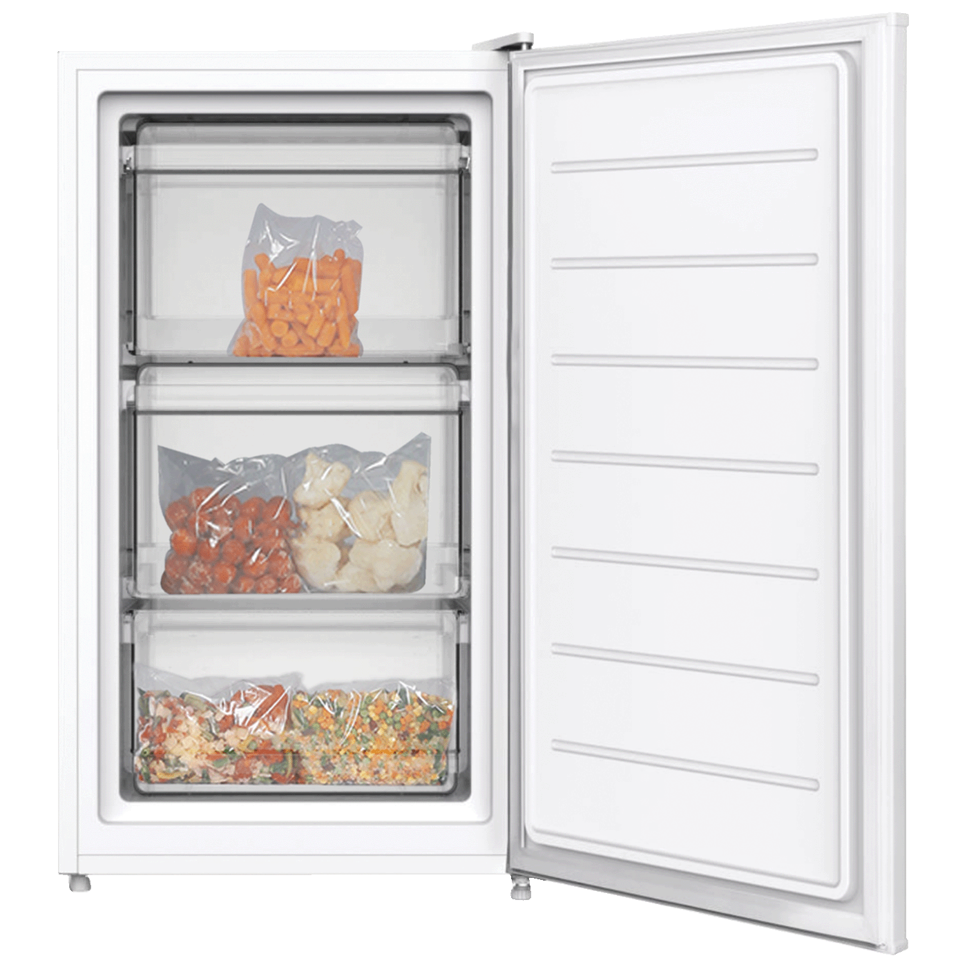 Zamrzivač ima korisni kapacitet od 60 litara, što je dovoljno za redovno zamrzavanje namirnica za porodicu. Tri prozirne ladice omogućuju pregledno slaganje i organizaciju. Termostat je diskretno smješten iza vrata, a smjer otvaranja vrata se po potrebi može promijeniti. Radi pri vrlo niskoj buci (maksimalno 41 dB), što ga čini gotovo neprimjetnim u prostoru. Energetski je efikasan uređaj, pogodnog klimatskog razreda (N/ST).