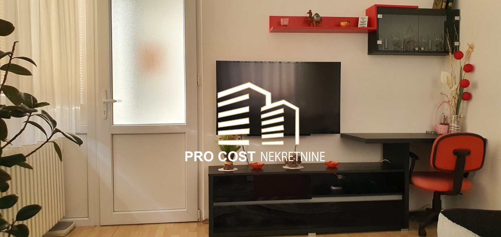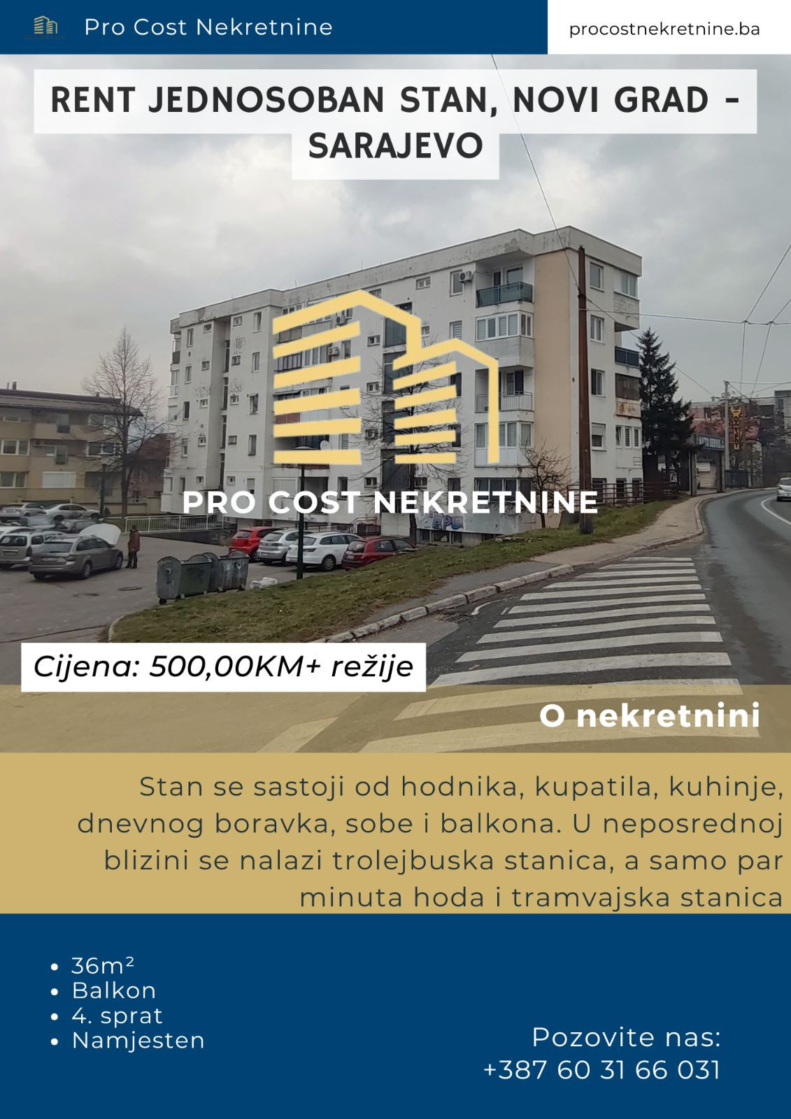 Pro Cost izdaje namješten stan površine 36 m2 na 4.spratu stambene zgrade bez lifta u naselju Švrakino selo, općina Novi grad Sarajevo. Stan se sastoji od hodnika, kupatila, kuhinje, dnevnog boravka, sobe i balkona. U neposrednoj blizini se nalazi trolejbuska stanica, a samo par minuta hoda i tramvajska stanica. Ispred zgrade se nalazi javni besplatan parking.