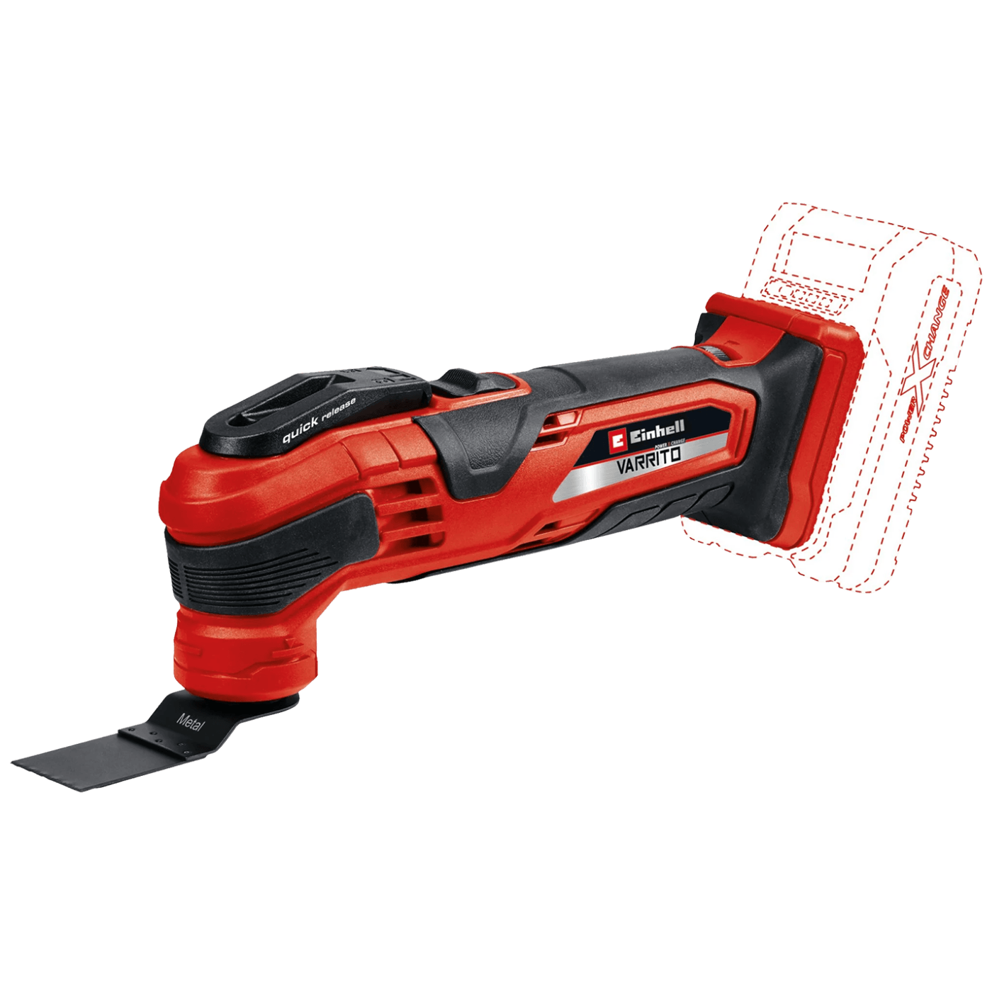 Akumulatorski multifunkcijski alat Einhell Varrito je visokokvalitetni pomoćnik za radove za proširenje i renoviranje i član porodice Power X-Change. Brzo oslobađanje i magnetna fiksacija alata obezbeđuju da se pribor može menjati bez alata. Elektronika brzine omogućuje uređaju da se podesi na određeni materijal. Oscilacija odvojene baterije za smanjenje vibracija omogućava udoban rad. Proizvod se isporučuje sa trougaonom brusnom pličom, devet listova brusnog papira (3*P60 / 3*P80 / 3*P120), brusilica za sečenje drveta i plastike (HCS) i jedan za metal (BIM ), segmentni list testere za drvo, plastiku i mekani metal (HSS) i dijamantni za ugaone spojeve. Isporučuje se bez baterije i punjača.