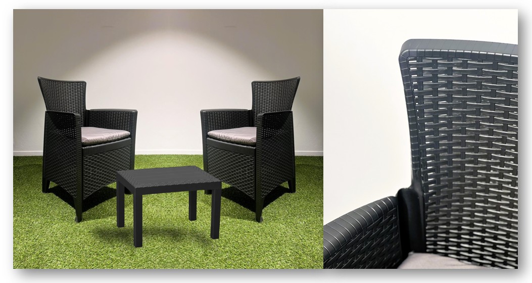 - Trodelni plastični set, dve stolice, sto, ratan stil, sa jastucima, udoban, prijatan za sedenje, ergonomski naslon
