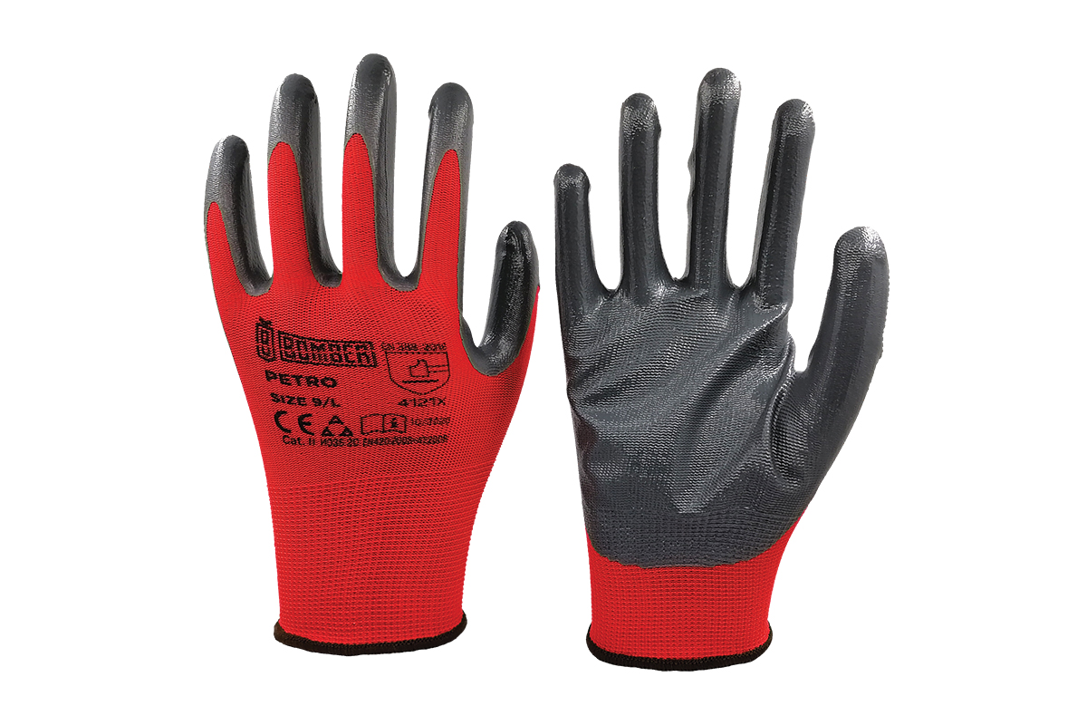 Pletene rukavice od crvenog poliestera, presvučene na dlanu slojem glatkog sivog nitrila. Otporne su na gorivo, ulje.