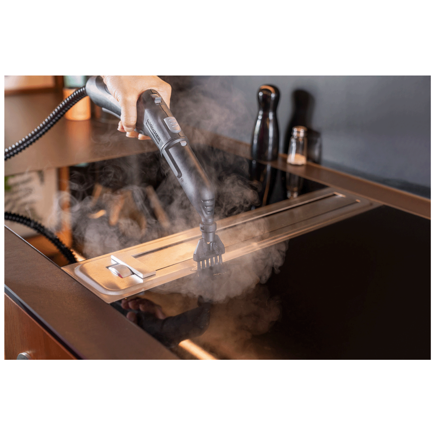 Idealan je za sve tvrde površine u domu, uključujući podove, pločice, sudopere, staklene površine i kuhinjske elemente. Zahvaljujući dvoslojnoj kontroli pare i osvjetljenoj LED indikaciji (crveno – grije se; zeleno – spreman), brzo prilagođava intenzitet pare potrebama površine i stepenu prljavštine.
