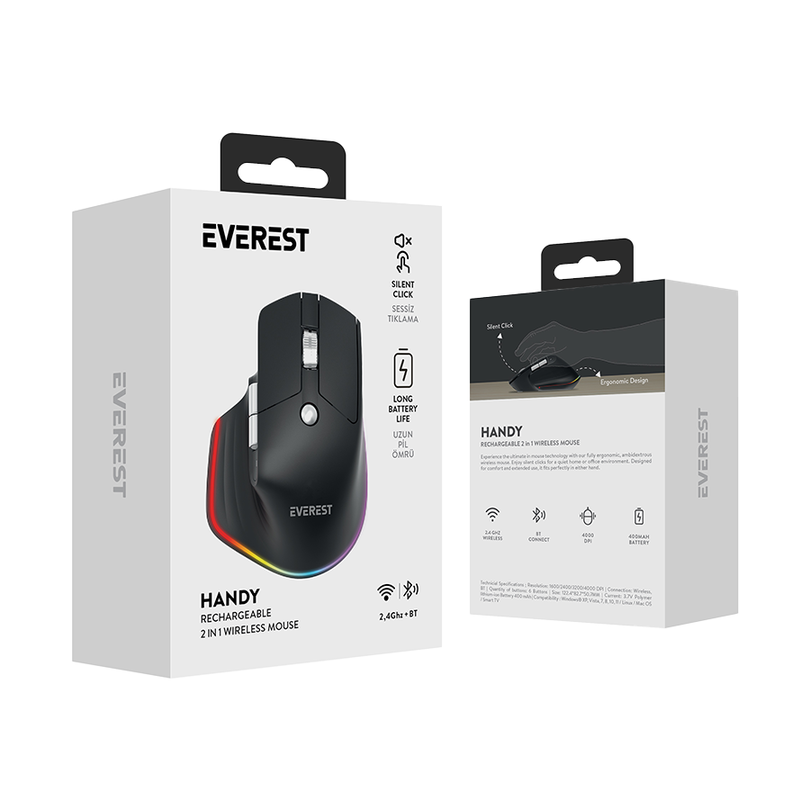 Miš Everest SMW- 178 Handy 2in1 Bluetooth 2,4GHz Black Rechargeable 4000 DPI Horizontal/Vertical Wheel Ergonomic RGB Mouse, 41042