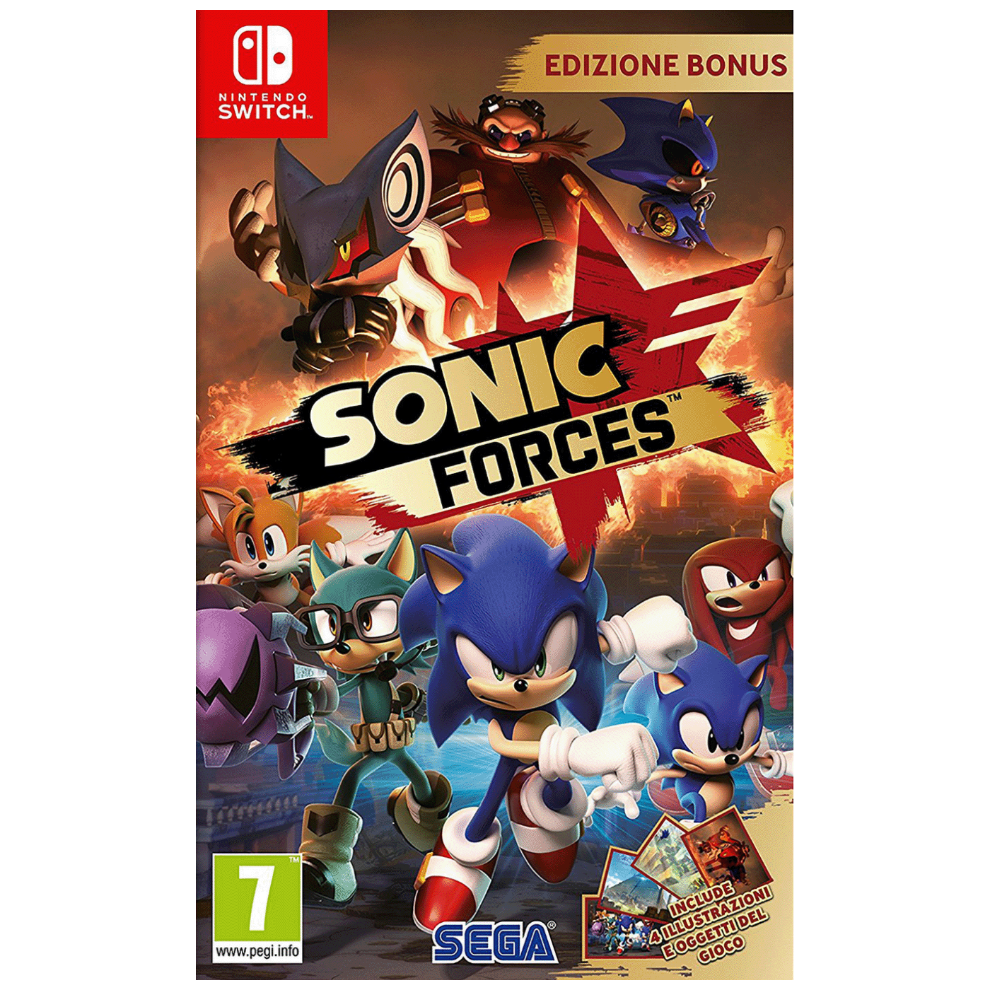 Sonic Forces Bonus Edition je akcijska platformska video igra za Nintendo Switch u kojoj igraš kao Sonic the Hedgehog i njegovi saveznici u borbi protiv zlog Dr. Eggmana koji je zavladao svijetom. Igra kombinira brze 3D sekvence kao Modern Sonic, klasične 2D platform sekvence kao Classic Sonic, i novi način igranja s potpuno prilagodljivim junakom kojeg opremaš gadgetima i sposobnostima kako bi se suprotstavio neprijateljima. Bonus Edition izdanje obično uključuje dodatne sadržaje kao što su Episode Shadow DLC, Sega/Atlus Pack DLC sa više outfita i dodatnih materijala te art kartice u fizičkim verzijama.