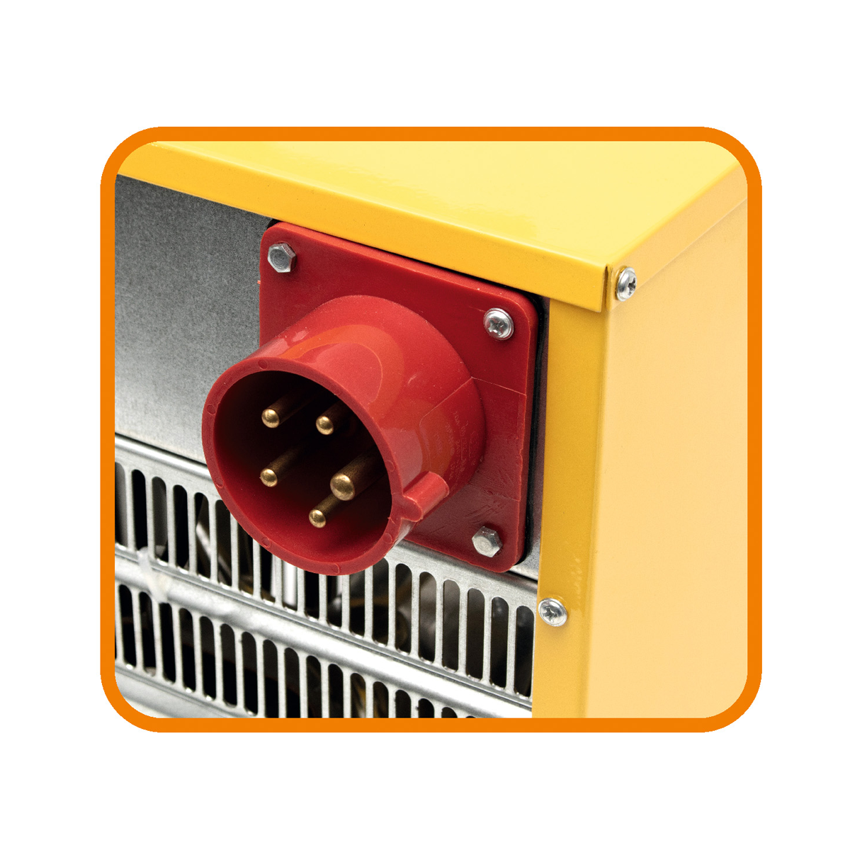Prijenosna industrijska grijalica sa ventilatorom, kalorifer, max. snaga 9000 W, mogućnost promjene snage 4500 W / 9000 W, ventilator sa konstantnim radom, mehanički termostat, statički farbano otporno metalno kučište sa, plastični rukohvat, automatsko isključivanje u slučaju pregrijavanja, IPX4 zaštita od prskajuće vode, dimenzije 350 x 510 x 370 mm, napajanje 400 V ~ / 50 Hz.