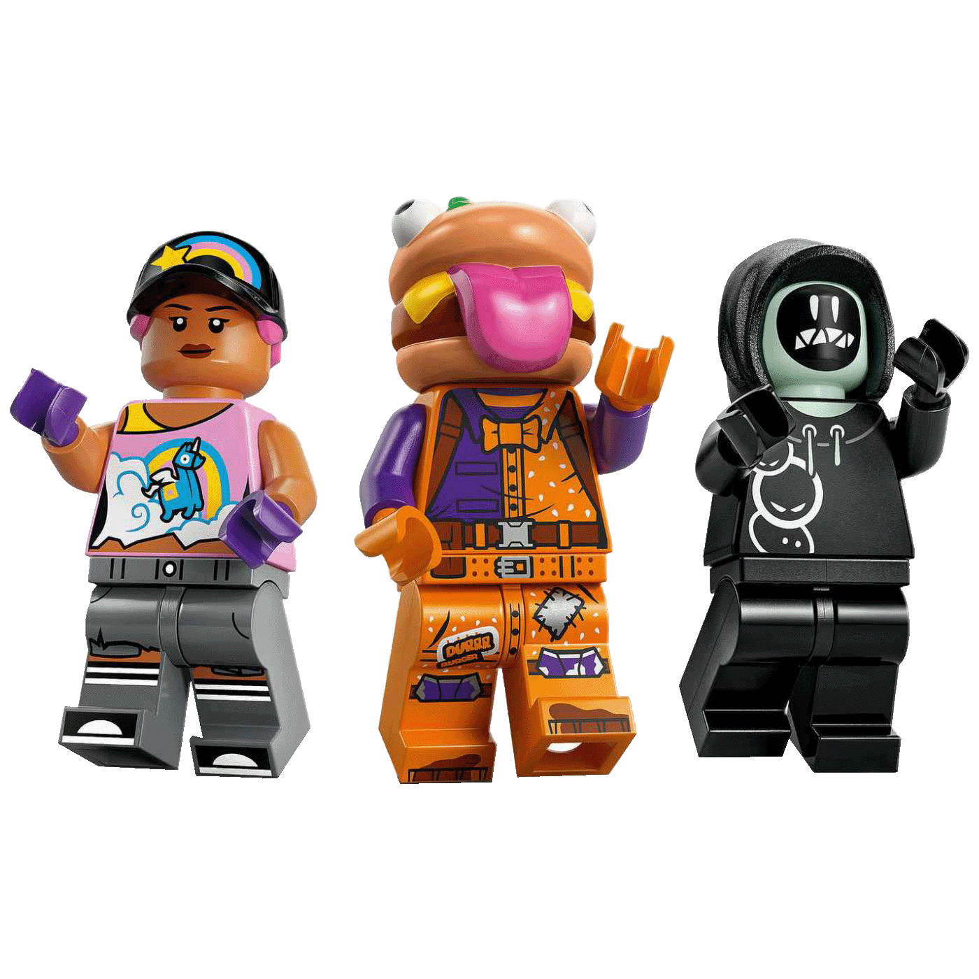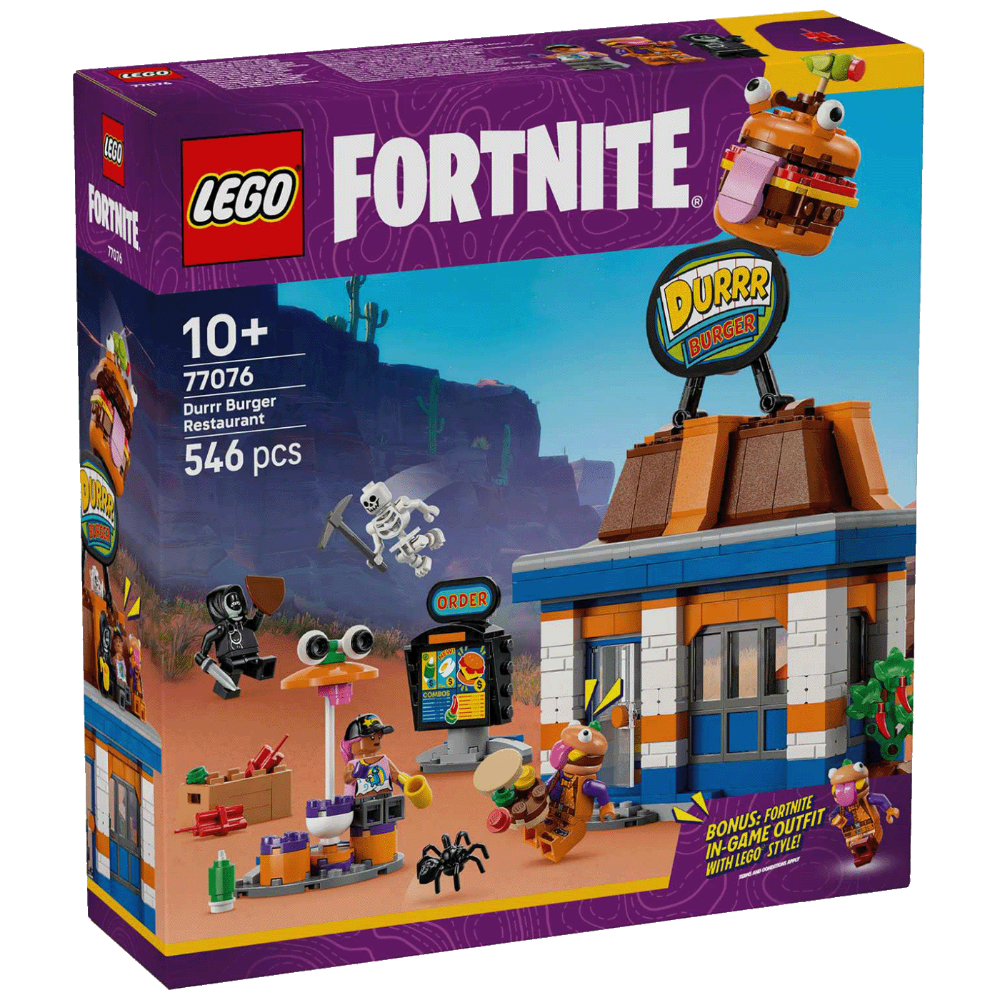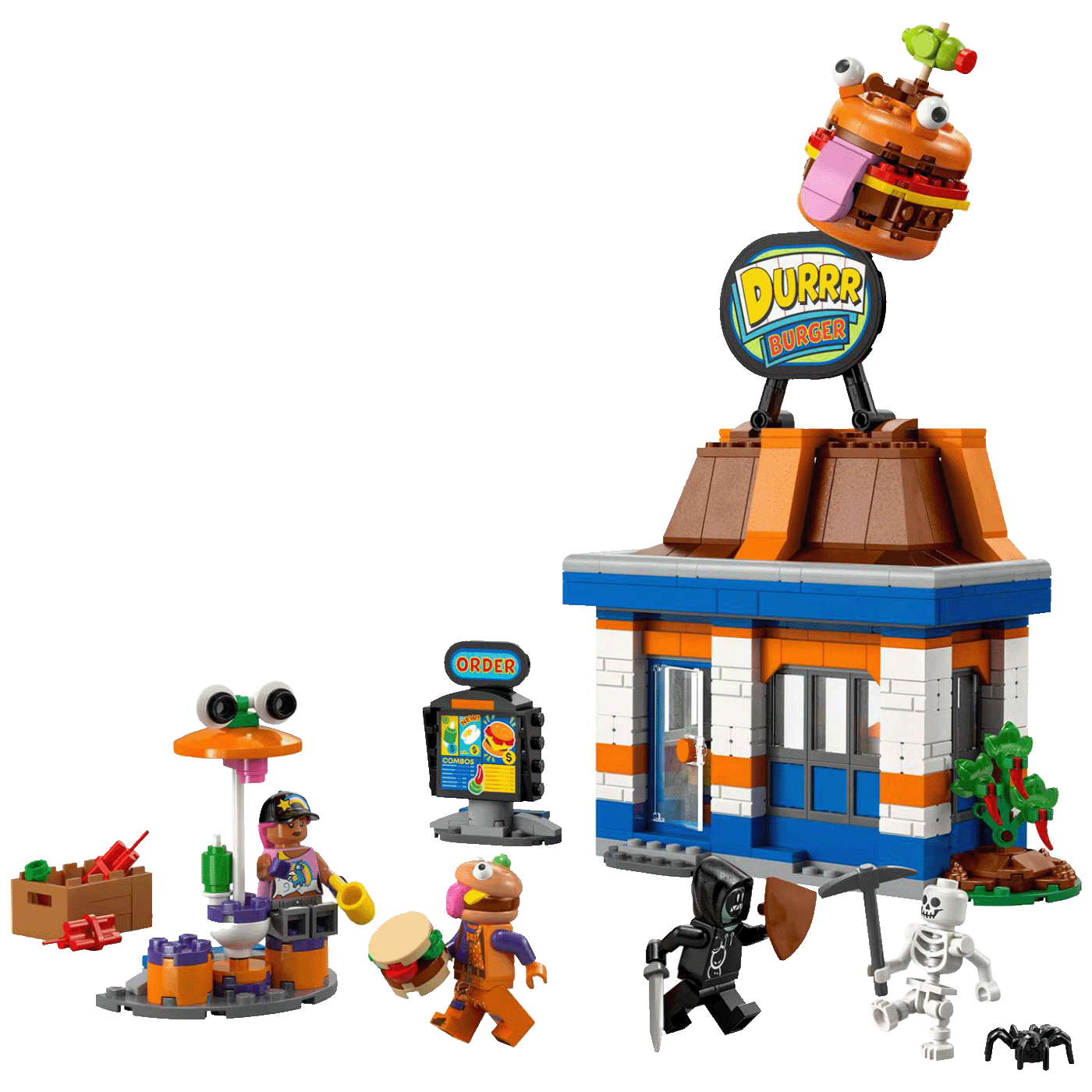 Uhvatila te glad? Posjeti legendarni restoran iz videoigre. Zabavi se dok slažeš model LEGO® Fortnite® Restoran Durrr Burger pa s figuricama uživaj u svim njegovim zabavnim detaljima. U kompletu su Beach Bomber, Beef Boss, Grimey i kostur, kao i super dodaci za zabavnu igru pretvaranja. Pregledaj jelovnik za naručivanje iz auta, popij nešto iz automata sa sokovima i pobjegni od pauka na tavanu!