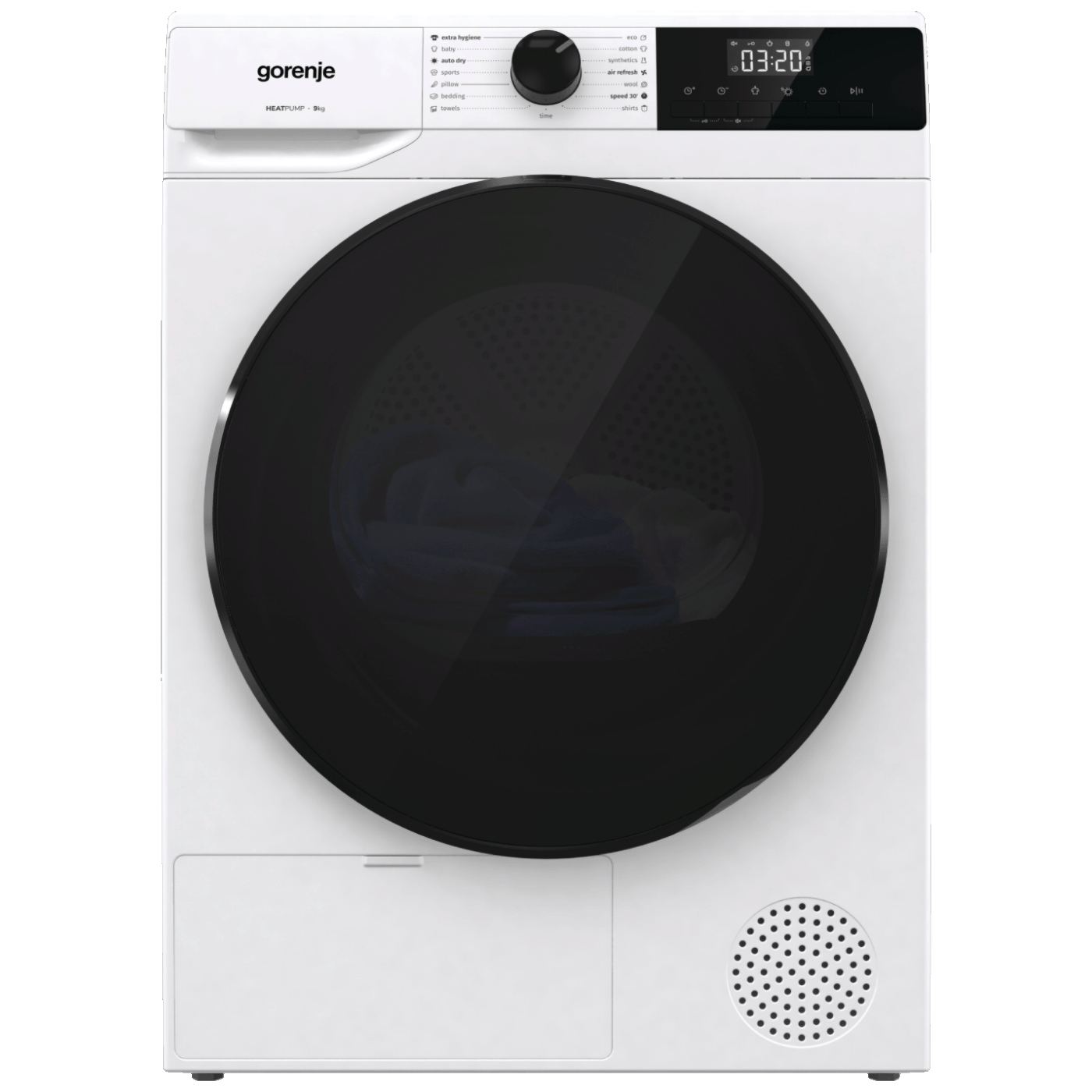 Gorenje DHNE83 je samostojeća kondenzacijska sušilica rublja sa toplotnom pumpom i kapacitetom sušenja do 8 kg, pogodna za veća kućanstva ili one koji često osuše puno veša. Ovaj model koristi TwinAir tehnologiju koja osigurava ravnomjerno kruženje toplog zraka kroz bubanj, čime se postiže nježno i efikasno sušenje tkanina bez prekomjernog gužvanja, što olakšava kasnije peglanje. Sušilica je opremljena AutoDrain sistemom, što omogućava direktan odvod kondenzata u odvod bez ručnog pražnjenja posude sa vodom. Upravljanje je jednostavno preko LED displeja s prikazom preostalog vremena rada, a dostupan je i set dodatnih funkcija i više programa sušenja za različite vrste odjeće i tkanina.