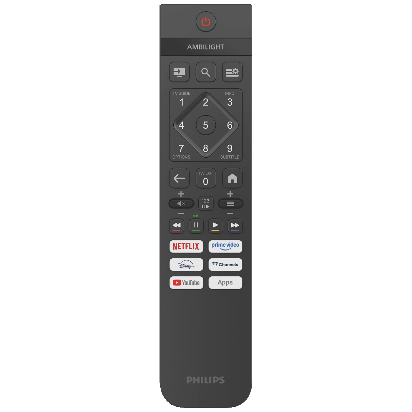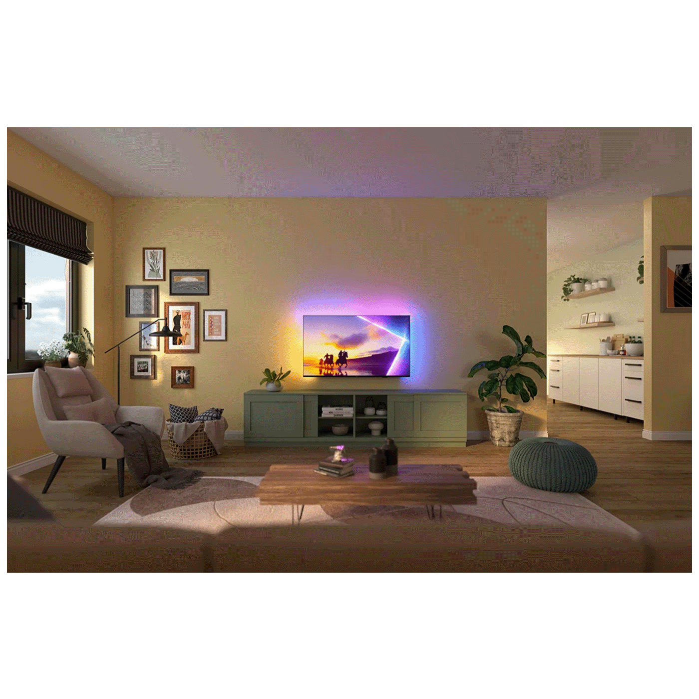 Ovaj QLED televizor donosi 4K Ultra HD rezoluciju sa živopisnim bojama i oštrim detaljima, uz podršku za napredne HDR formate koji dodatno poboljšavaju kontrast i svjetlinu. Ambilight tehnologija proširuje sliku izvan okvira ekrana projiciranjem svjetla na zid iza televizora, stvarajući impresivniji doživljaj gledanja filmova, serija i sporta. Smart TV platforma omogućava pristup popularnim streaming aplikacijama i online sadržaju, dok snažan procesor osigurava fluidan rad sistema. Moderan dizajn sa tankim okvirima lako se uklapa u svaki prostor.