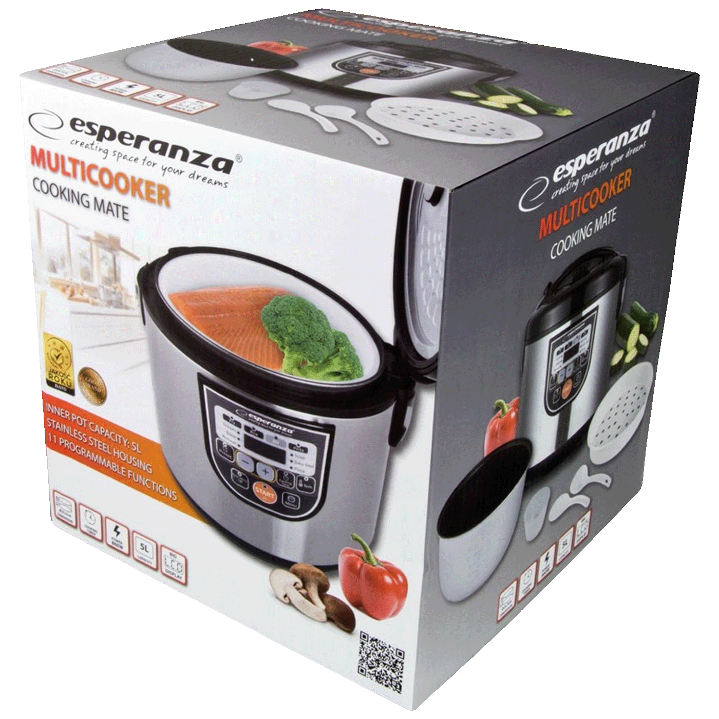 Esperanza Multicooker Cooking Mate je višenamjenski kuhinjski aparat koji ti pomaže da pripremiš razne vrste jela brže i jednostavnije u jednom uređaju. Ovaj multicooker sadrži više funkcija poput električnog lonca, friteze zraka, parnog kuhača i pečenja kolača ili hljeba, što ti omogućava pripremu zdravijih obroka uz manje masnoće i uz uštedu prostora u kuhinji. Zahvaljujući LCD ekranu s intuitivnim programima lako je podesiti vrijeme i temperaturu kuhanja, a veliki kapacitet unutrašnje posude omogućava spremanje većih obroka za cijelu porodicu. Aparat dolazi s korisnim dodacima kao što su mjerna čaša, žlica za rižu, kutlača za juhu i parna košara.