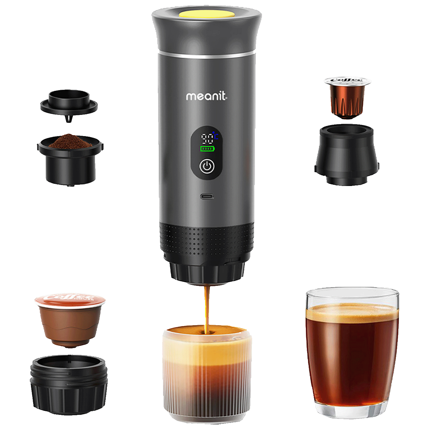 MEANIT Z01 PRO je prijenosni aparat za kafu namijenjen ljubiteljima espressa koji žele spremiti i pripremiti kafu bilo gdje — na poslu, putovanju ili kampiranju. Ovaj kompaktni aparat omogućava brzo ekstrakciju kafe zahvaljujući sustavu visokog tlaka i kompatibilnosti s kapsulama te je dizajniran tako da bude praktičan za korištenje bez obzira na dostupnost standardne utičnice ili velikog kućanskog aparata.