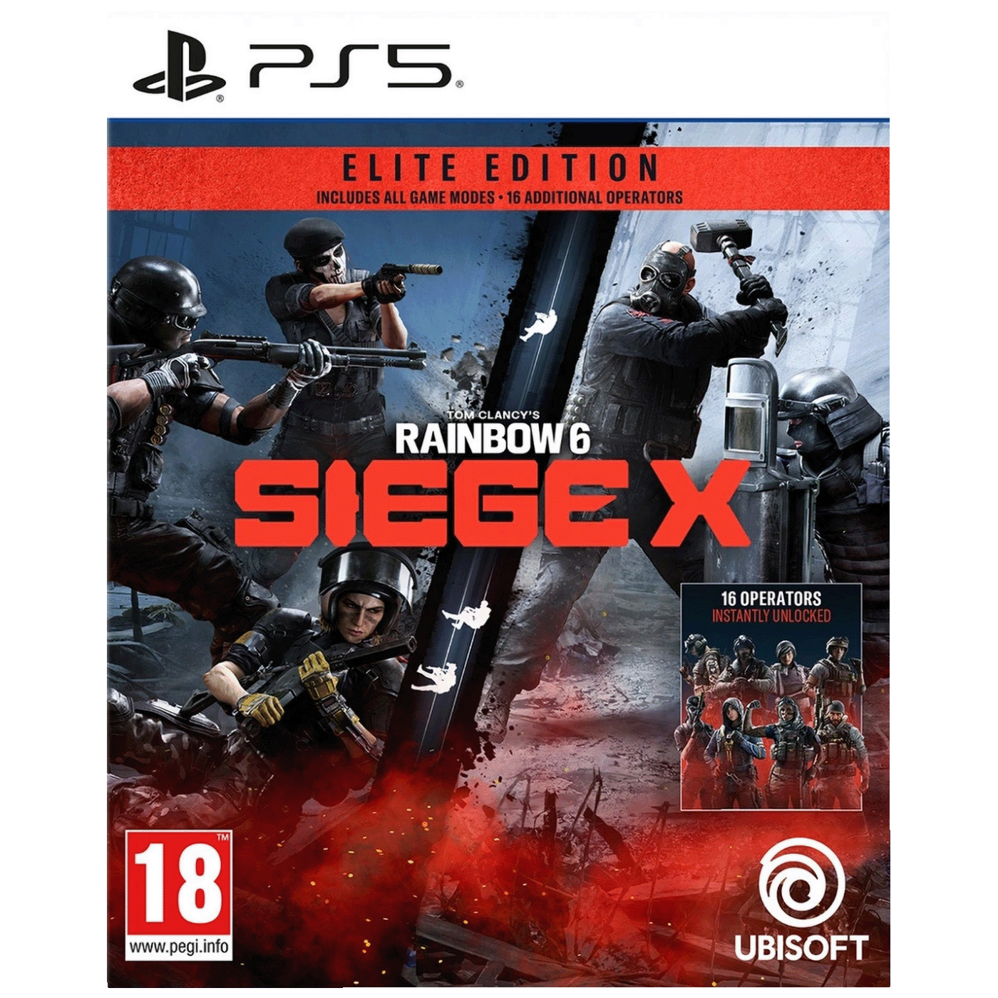 Tom Clancy’s Rainbow Six Siege X – Elite Edition je taktička pucačka igra iz Ubisoft serije koja donosi vrhunsku timsku strategiju i borbu 5v5, naglašenu taktičkim planiranjem, radom s opremom i destruktivnim okruženjem. Igra je evolucija originalne Rainbow Six Siege igre, s unaprijeđenim taktičkim elementima, Dual Front 6v6 modom za PS5, te dodatnim načinima igranja i operatorima za dublje taktičko iskustvo. Elite Edition omogućuje pristup više modova igre, uključujući Quick Match, Unranked, Ranked liste i Siege Cup, kao i trenutno otključavanje 16 dodatnih operatora za raznovrsniji gameplay i taktičke opcije. Igra zahtijeva internet vezu, Ubisoft račun i PlayStation Plus pretplatu za online igranje.