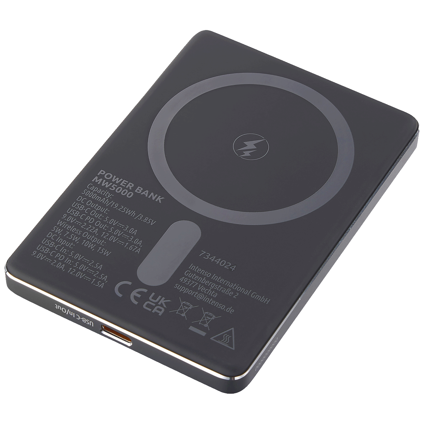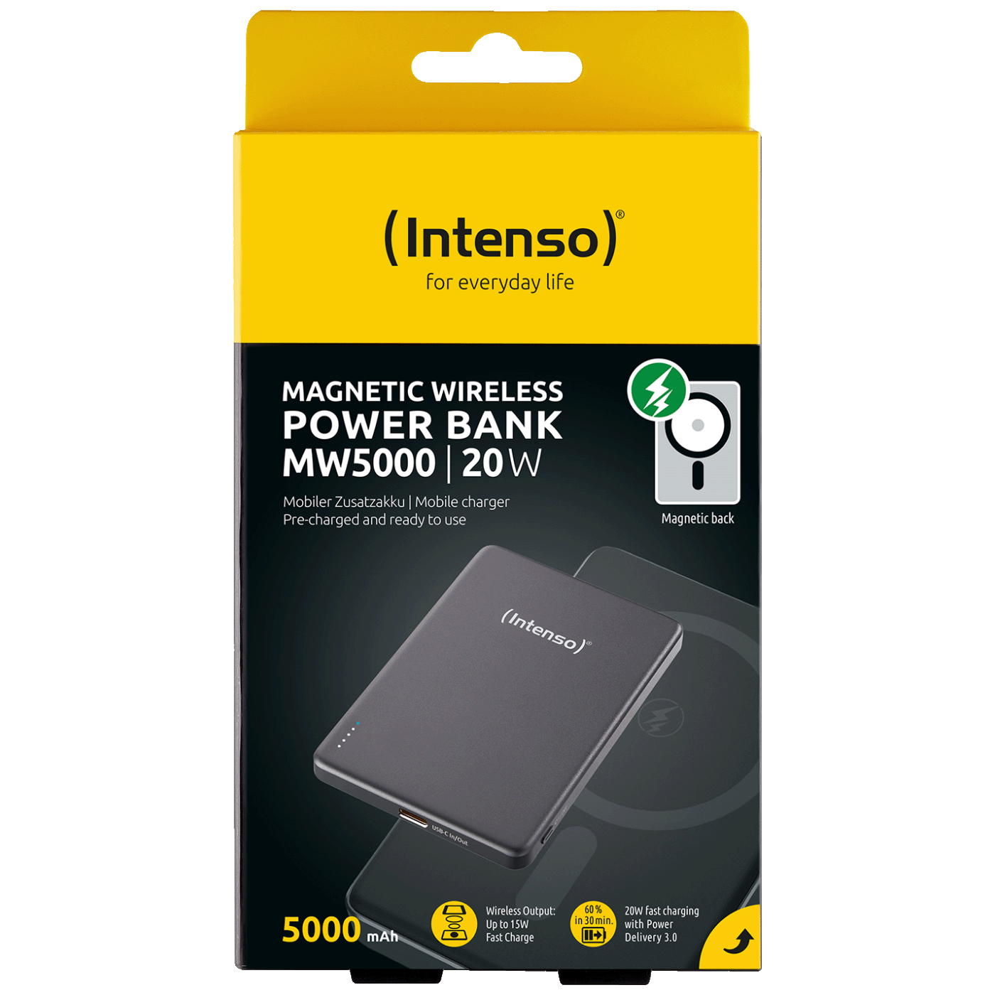 Intenso MW5000 je ultra-tanak i lagan power bank kapaciteta 5.000 mAh koji omogućava brzo punjenje do 20 W preko USB-C PD i bežično punjenje do 15 W po Qi standardu. Zahvaljujući kompaktnim dimenzijama, idealan je za svakodnevno nošenje i brzo dopunjavanje uređaja u pokretu.