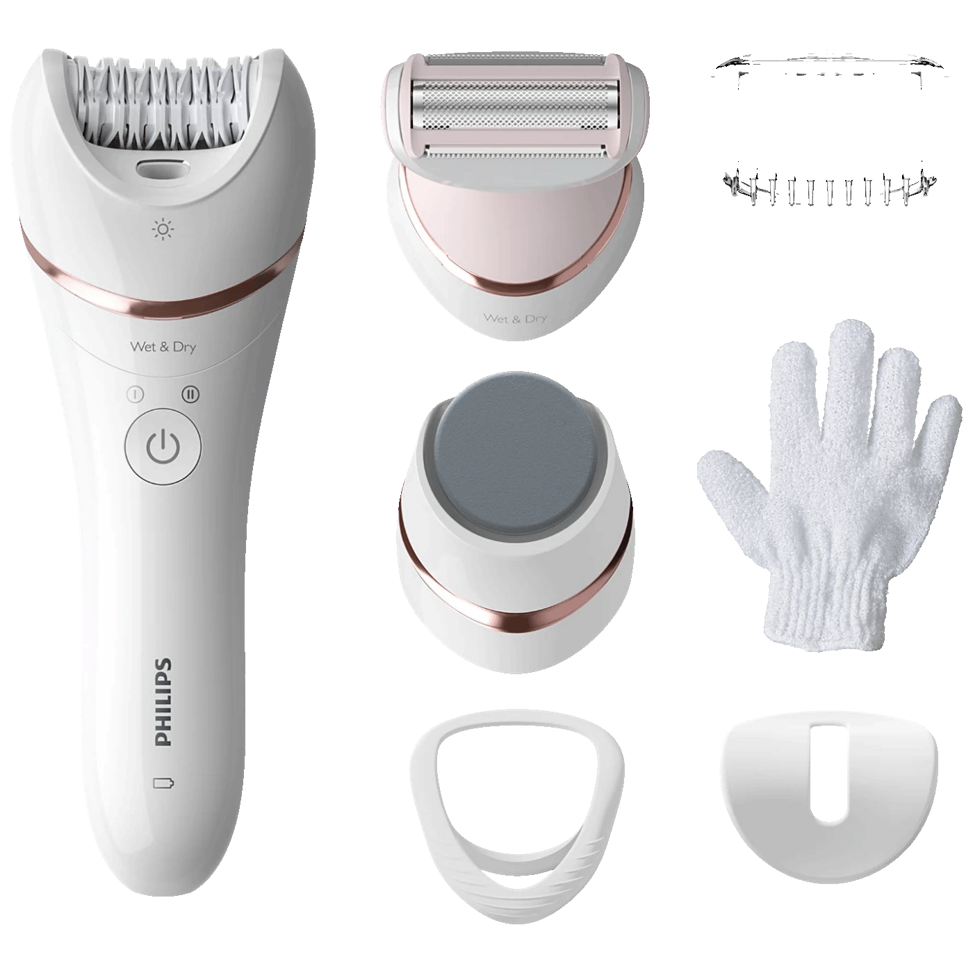 Komplet dolazi s raznovrsnim dodacima poput depilacijske rukavice za piling, turpije za stopala, glave za brijanje i češlja za oblikovanje bikini zone – sve što ti treba za kompletnu rutinu njege tijela.