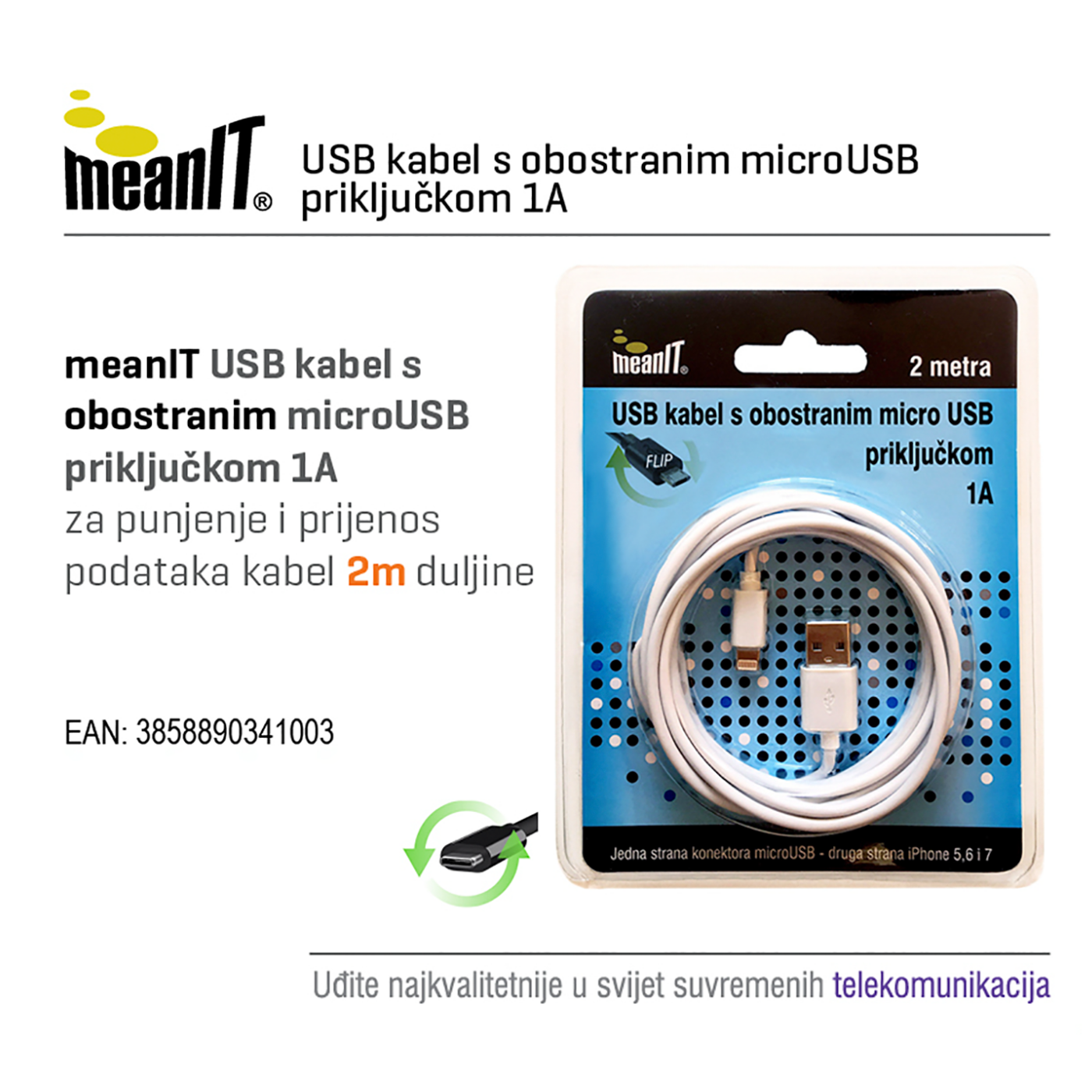 MeanIT USB A na USB micro kabl, FLIP, dužina 2.0 metra - USB / micro USB - 2m