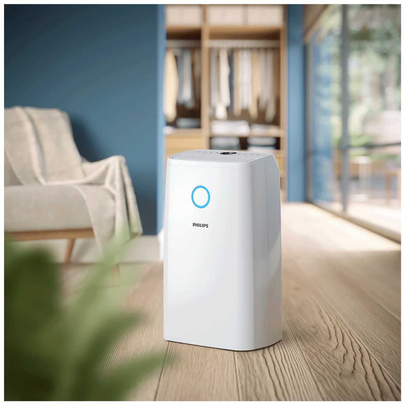 Philips DE3306/11 iz Serije 3000 je kompaktan i snažan električni odvlaživač zraka dizajniran za brzo obnavljanje optimalne klime u unutrašnjim prostorijama. Uklanja višak vlage iz zraka i pomaže spriječiti nastanak plijesni, gljivica, ustajalih mirisa i kondenzacije, čineći zrak ugodnijim i zdravijim za boravak. Odvlaživač dnevno izvuče do 34,3 l vode iz zraka i idealan je za prostorije do 150 m³. Ugrađena AeraSense tehnologija automatski prati kvalitet zraka i prilagođava rad uređaja za efikasniji učinak, dok intuitivni prikaz boje i numerički zaslon olakšavaju praćenje trenutnih parametara. DE3306/11 također nudi načine rada za sušenje rublja i kontinuirano odvlaživanje te aromaterapijski dodatak za osvježavanje zraka.