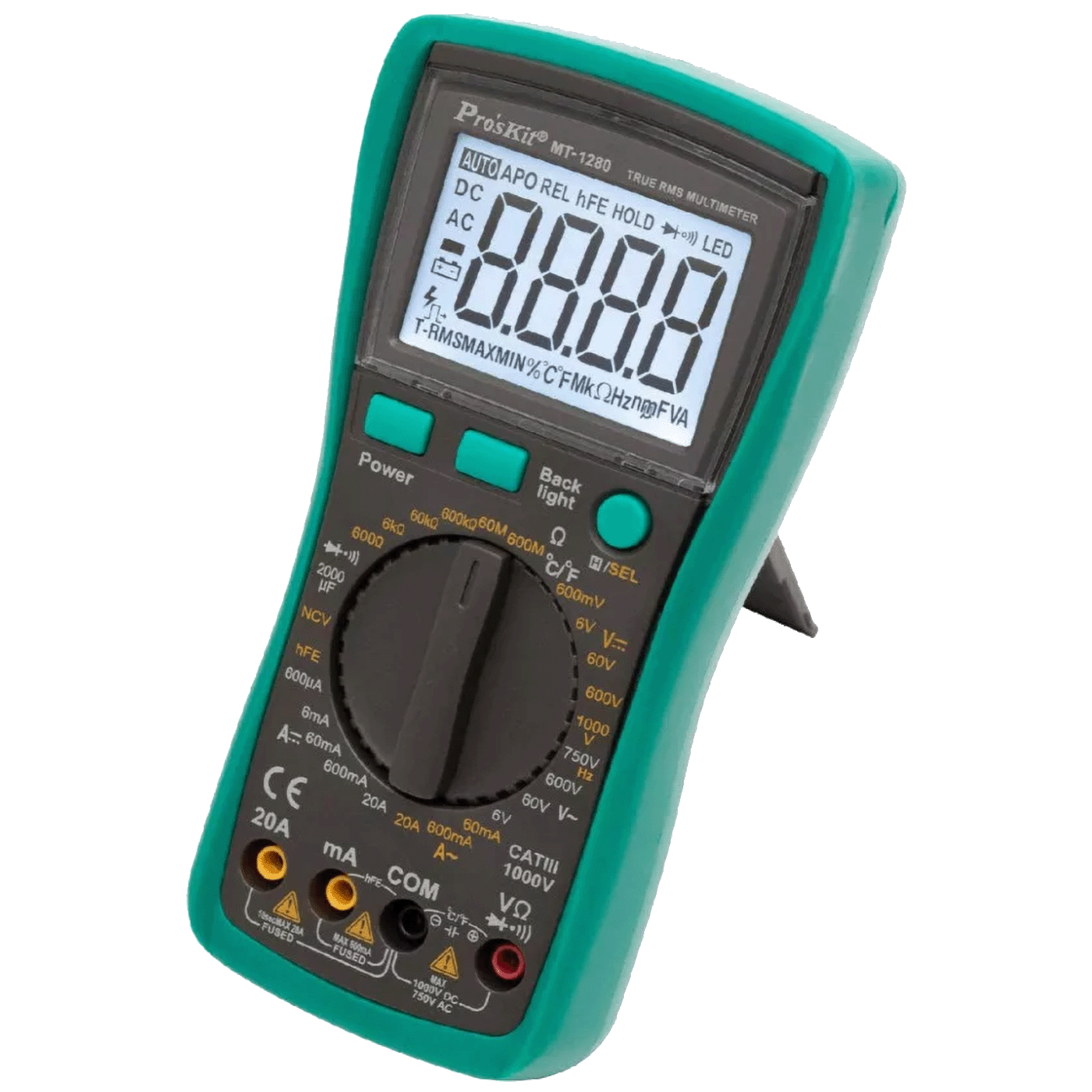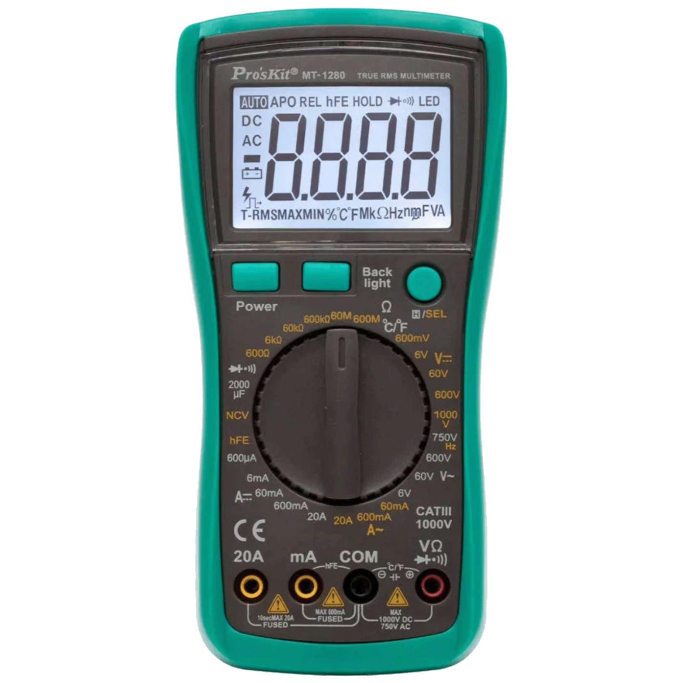 Uređaj ima veliki, pozadinski osvijetljeni ekran koji je lako čitljiv čak i u tamnim uvjetima. TRUE RMS tehnologija omogućava mjerenje stvarnih efektivnih vrijednosti za bilo koji oblik signala, osiguravajući pouzdane i točne rezultate. Bilo da se radi o izmjeničnoj ili jednosmjernoj struji (AC/DC), naponu, otpornosti, kapacitetu, frekvenciji ili određivanju karakteristika tranzistora, MT-1280 nudi rješenje za sve.