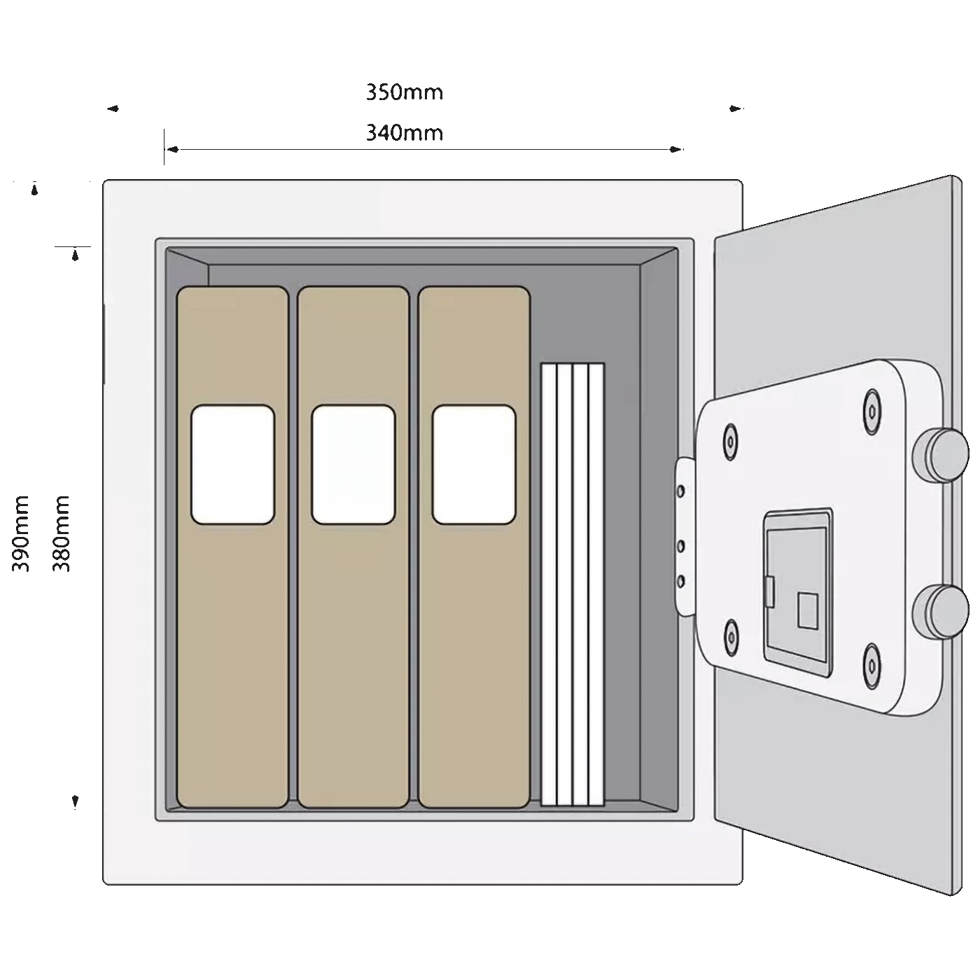 Sef je opremljen i mehaničkim rezervnim ključem koji omogućava pristup u slučaju zaboravljenog koda ili praznih baterija. Unutrašnjost sefa je obložena kako bi se zaštitili osjetljivi predmeti od ogrebotina, dok predviđene montažne rupe omogućavaju pričvršćivanje sefa za zid ili pod radi dodatne sigurnosti.