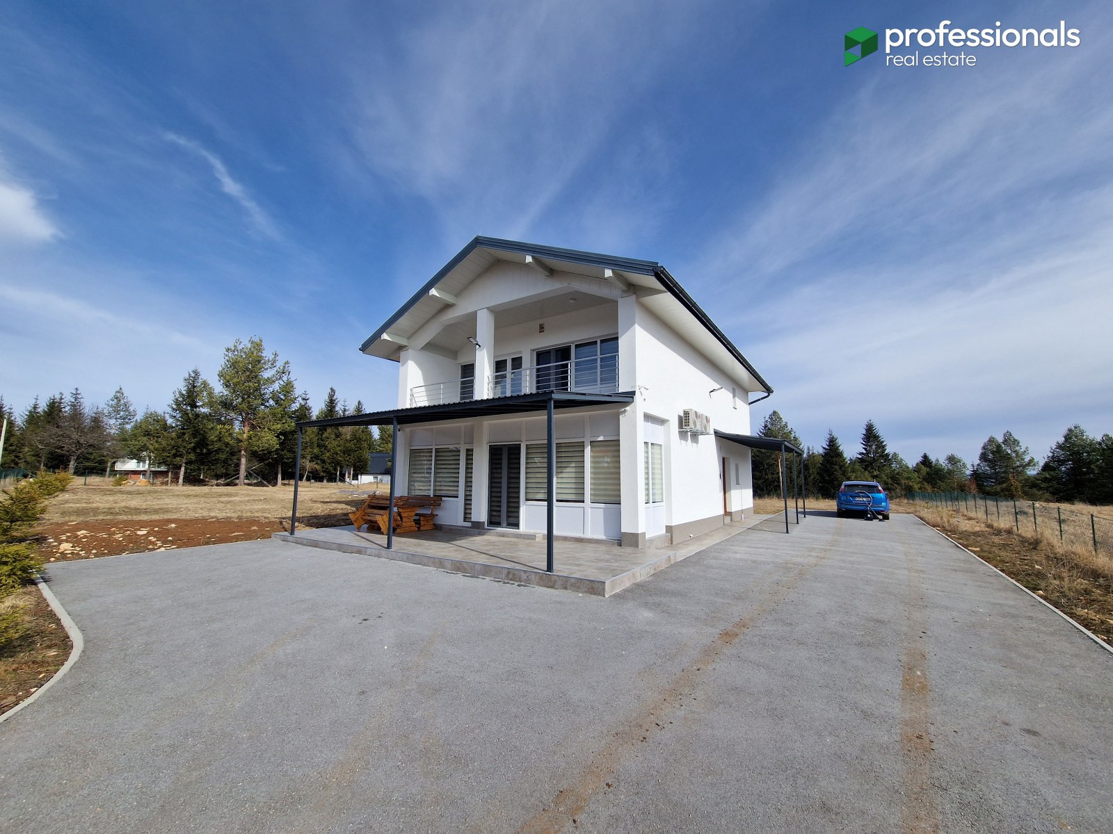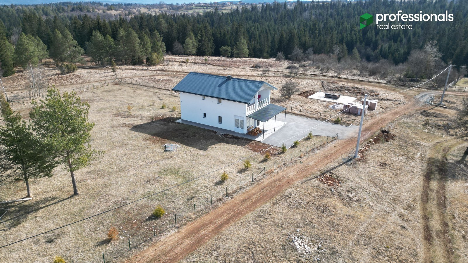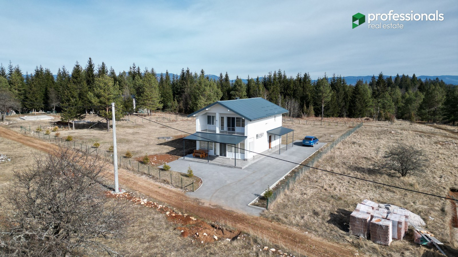 Predmetna nekretnina je izgrađena 2022. godine na zemljištu površine 2384 m2, te je sa parcelom pored (995 m2) ukupna površina zemljišta 3379 m2. .Sastoji se od dvije etaže: prizemlje i prvi sprat ukupne površine 180 m2. Etaže su skoro indentičnog rasporeda, te se na svakoj nalazi dnevni boravak sa kuhinjom i trpezarijom, spavaća soba, kupatilo i prostranea terasa sa prelijepim pogledom.