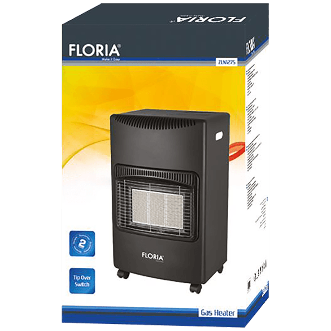 Plinska grijalica, ZLN1275, snaga 1400 / 2800 / 4200 W, 3 keramičke grijaće ploče izrađene od specijalnog keramičkog materijala sa mikro perforacijama sa visokom toplotnom otpornošću i sa uzastopnim paljenjem, piezo - električno paljenje, površina grijanja 30 - 60 m², unutarnje fiksiranje i prostor za plinsku bocu ( do 15kg ), kotačići za lako pomjeranje. obezbijeđena su 3 nivoa zaštite: sustav zaštite koji prekida snabdijevanje plina ako poraste koncentracija CO i CO2, sustav zaštite ako ako plamen usporava ili se gasi, metalna rešetka koja ograničava pristup elementima sagorijevanja