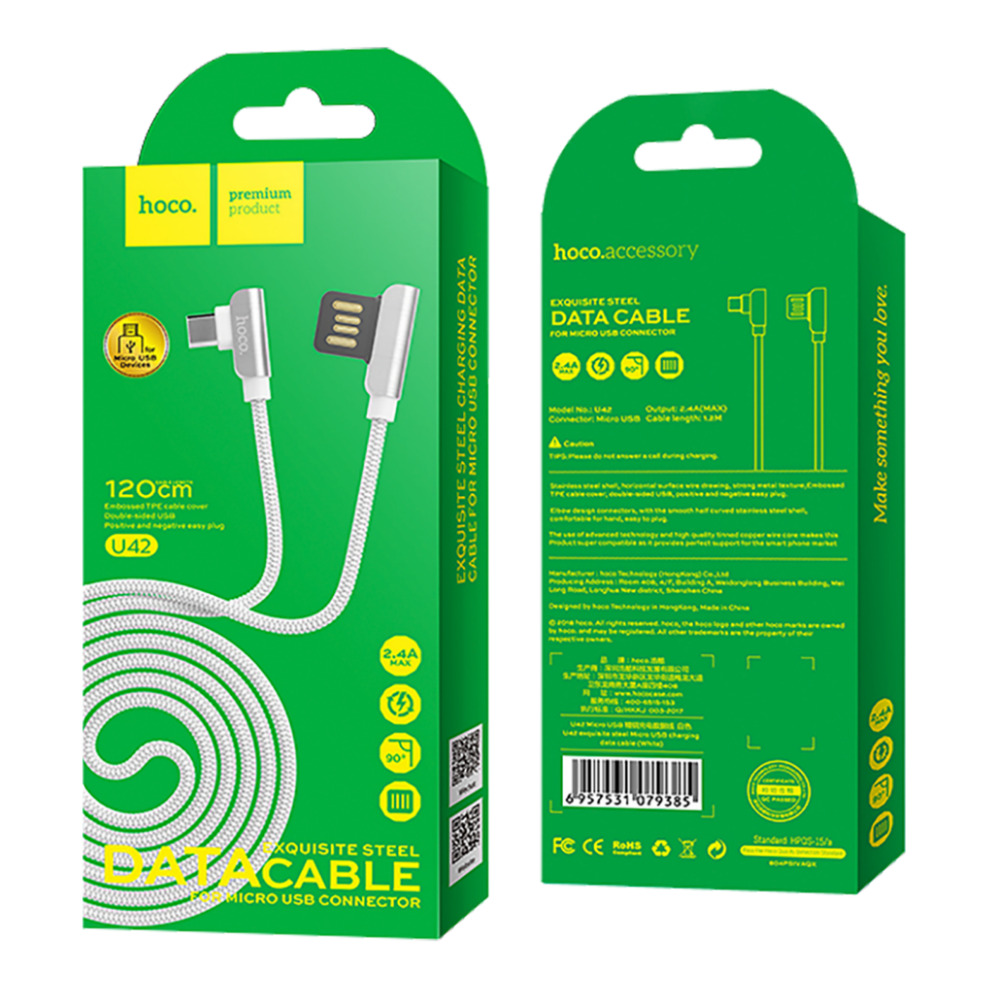 hoco. USB kabl za smartphone, micro USB, 1.2 met., 2.4 A, bijela - U42 Exquisite steel, Micro USB, WH