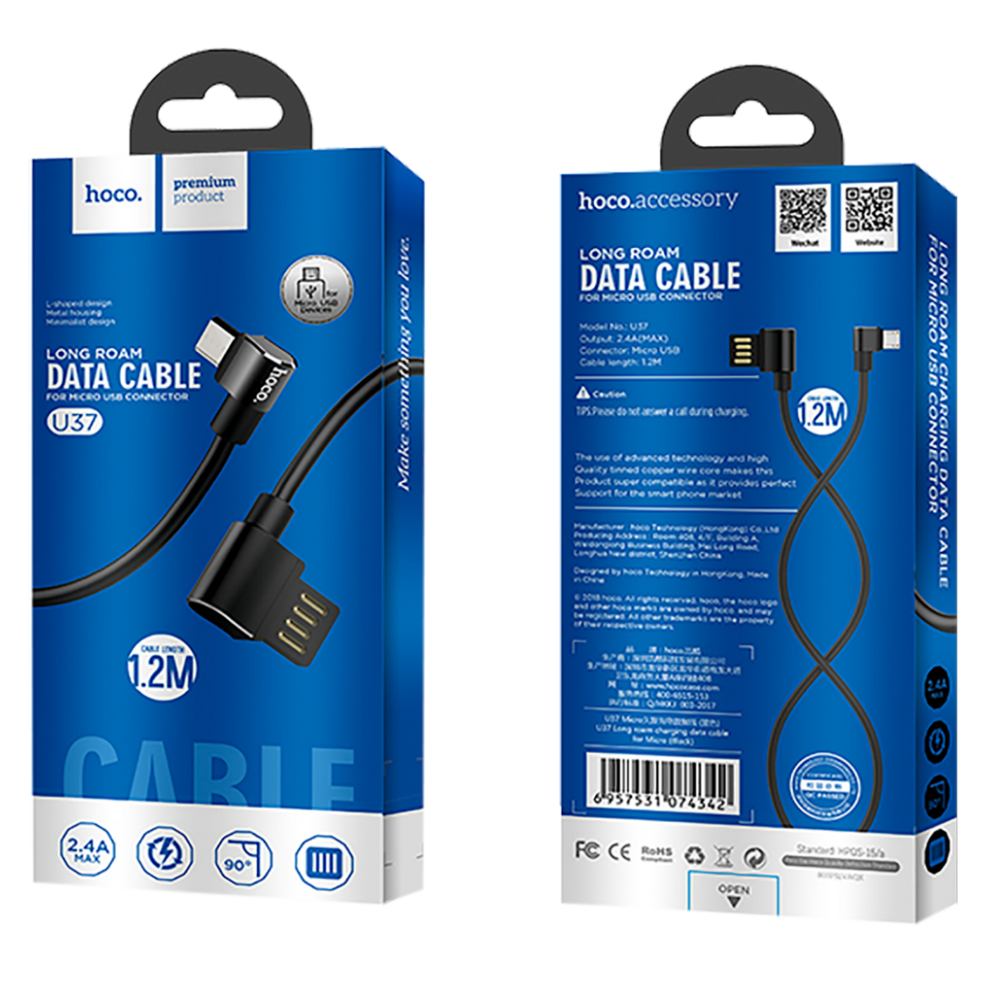 hoco. USB kabl za smartphone, micro USB, kutni 90°, 1.2 met,crna - U37 Long Roam, Micro USB , BK
