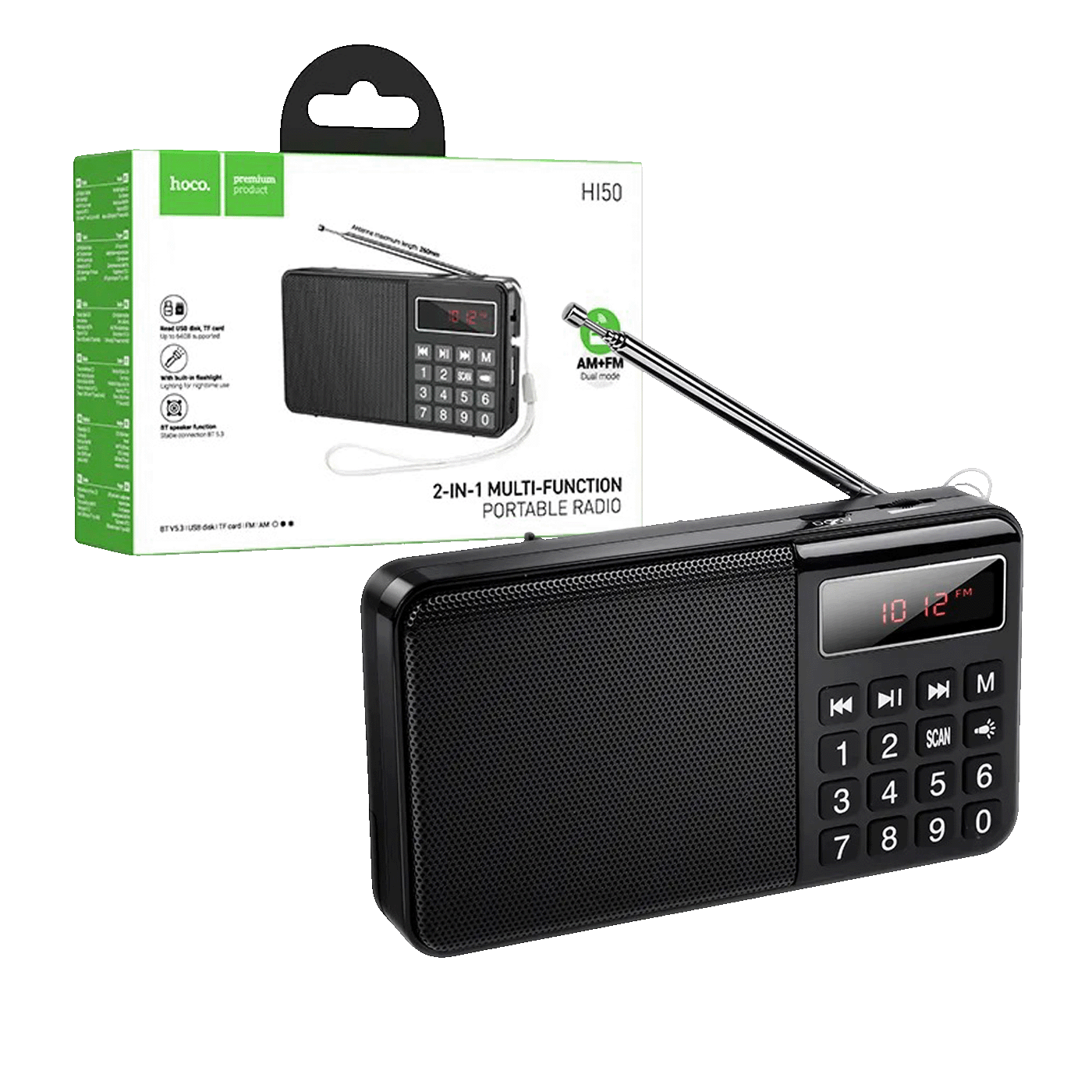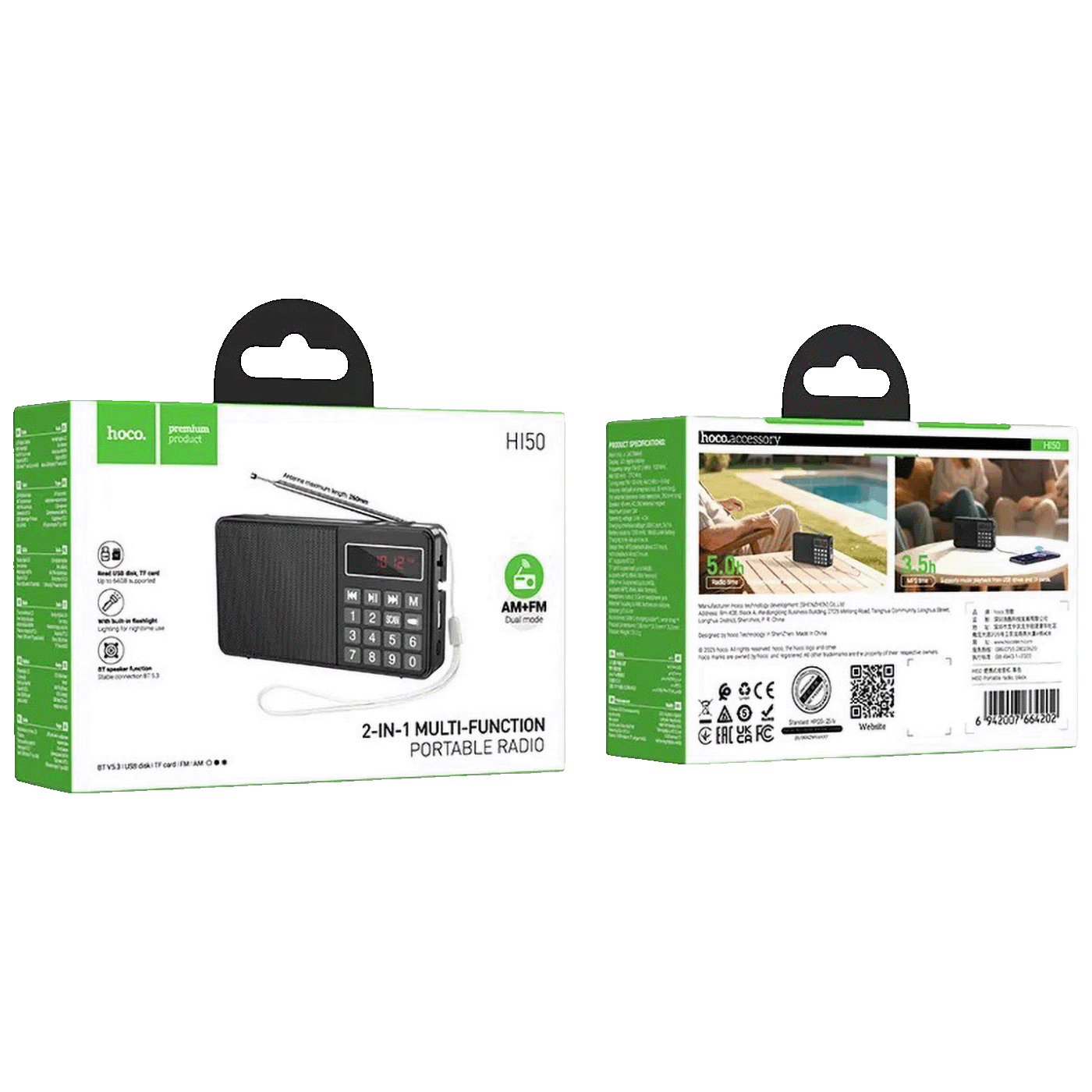 Hoco HI50 je kompaktan prijenosni radio s FM/AM radiom, MP3 playerom i Bluetooth 5.3 povezivanjem. Ugrađena baterija kapaciteta 1200 mAh omogućava do 5 sati slušanja radija, dok podrška za TF kartice, USB-A memorije i 3,5 mm Mini Jack priključak za slušalice čini ovaj uređaj idealnim za dom, vrt i putovanja.