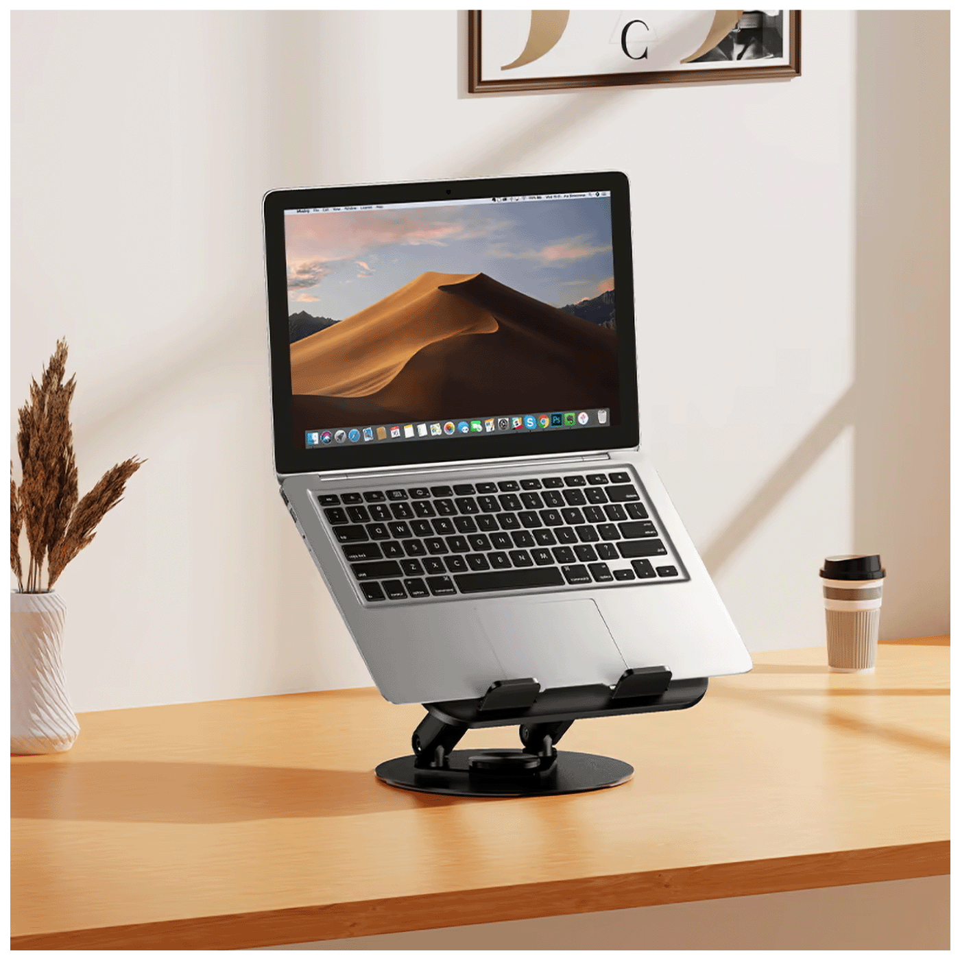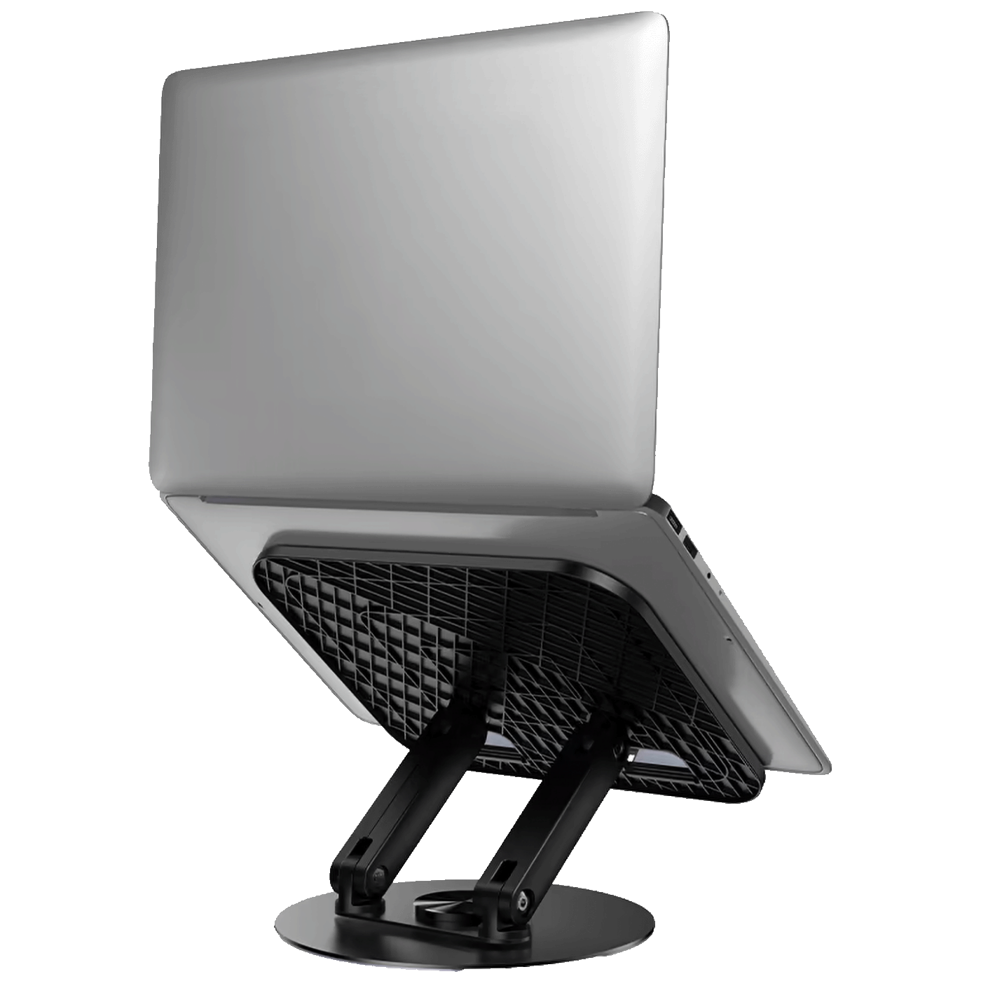 Stalak je izrađen od kombinacije metala i ABS plastike, što osigurava čvrstoću i dugotrajnost. Zahvaljujući rotaciji od 360° i teksturiranoj površini protiv klizanja, uređaj ostaje sigurno postavljen čak i pri intenzivnom korištenju. Sklopivi dizajn olakšava spremanje i transport, pa je stalak pogodan za kancelariju, kućni rad ili putovanja.