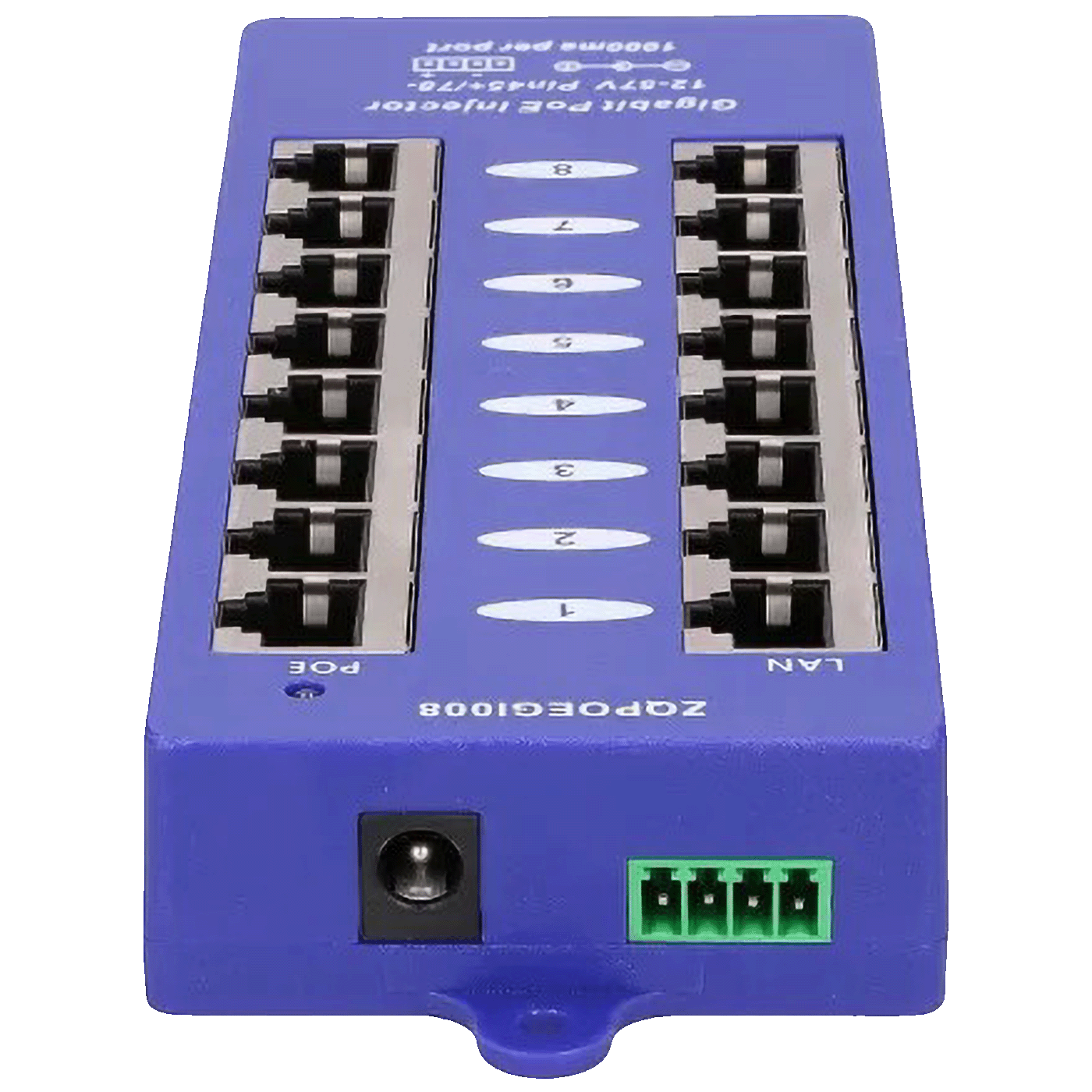 Ovaj model dolazi sa 8 LAN portova i 8 PoE portova, podržavajući Gigabit Ethernet brzine do 1000 Mb/s za stabilan i brz prijenos podataka. Radi u Mode B konfiguraciji, gdje se napajanje prenosi preko pinova 4/5 (+) i 7/8 (-). Uređaj koristi fleksibilno napajanje do 60V DC i omogućava jednostavnu integraciju sa postojećim mrežama. Plug & Play funkcionalnost osigurava brzu instalaciju bez potrebe za dodatnim podešavanjima.