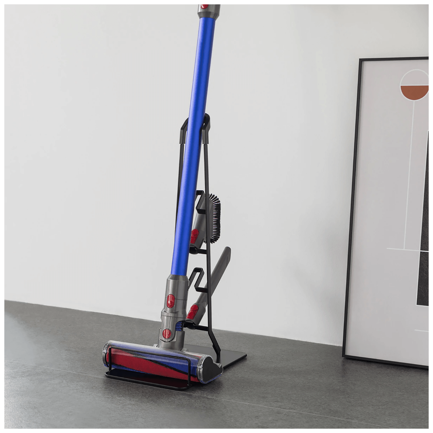 Plastična ručka nudi čvrsto držanje za usisavača. Opterećena baza sa zaštitnom šipkom pruža dovoljno prostora za usisavač, istovremeno osiguravajući stabilnost.
