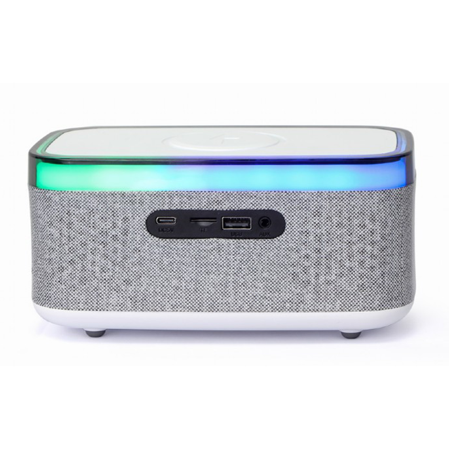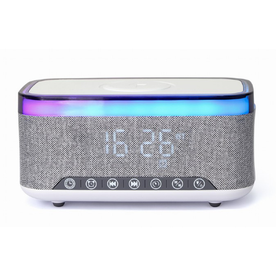 Digitalni sat sa zvučnikom i wireless bežičnim punjačem za mobitel bluetooth GEMBIRD, white/light grey, DAC-SPKBT-QC15-GR