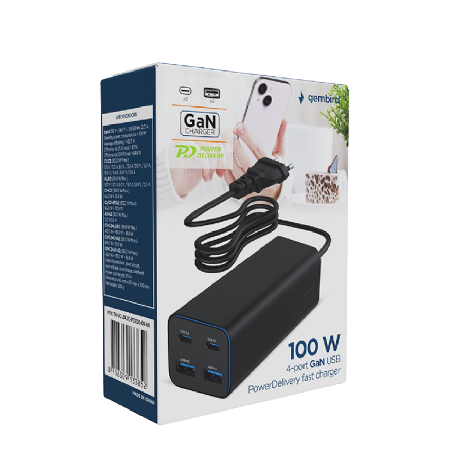 USB punjač 2xType-C + 2xUSB-A 4-port 100 W GaN USB PowerDelivery fast charger, black, GEMBIRD, TA-UC-2A2C-PD100-01-BK