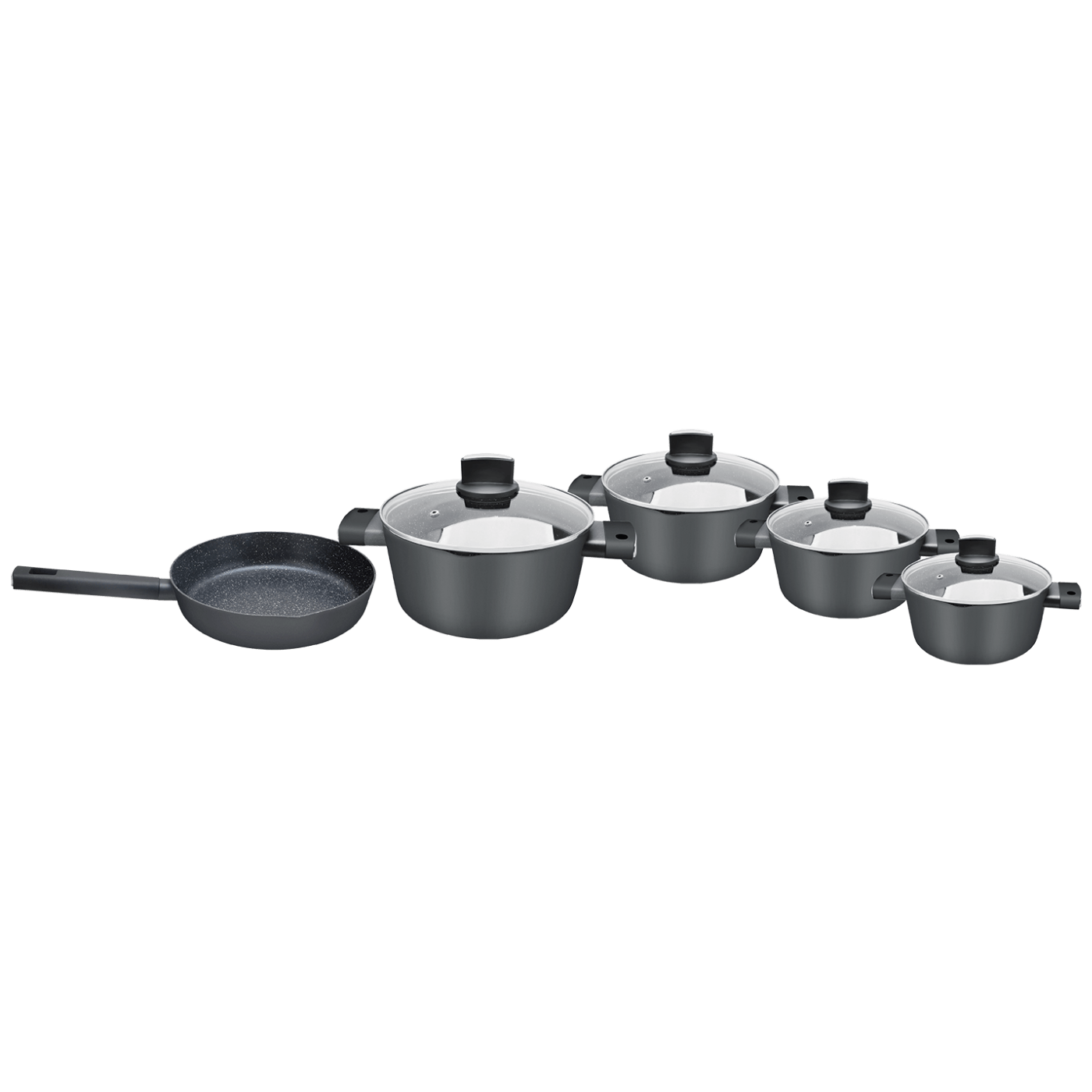 Set se sastoji od: 4 šerpe ( 18, 20, 24, 28 cm), 1 tava 26 cm, 4 staklena poklopca otporna na visoke temperature.