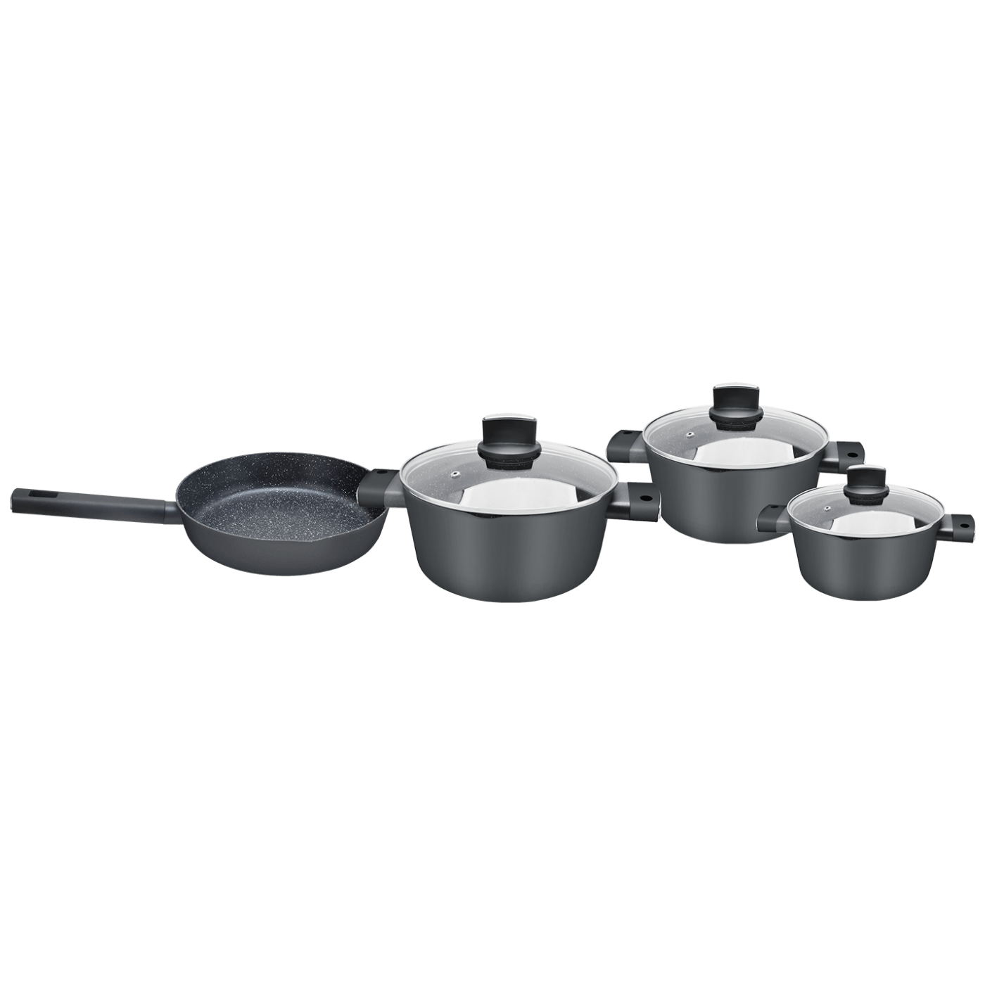Set se sastoji od: 3 šerpe ( 20, 24, 28 cm), 1 tava 26 cm, 3 staklena poklopca otporna na visoke temperature.