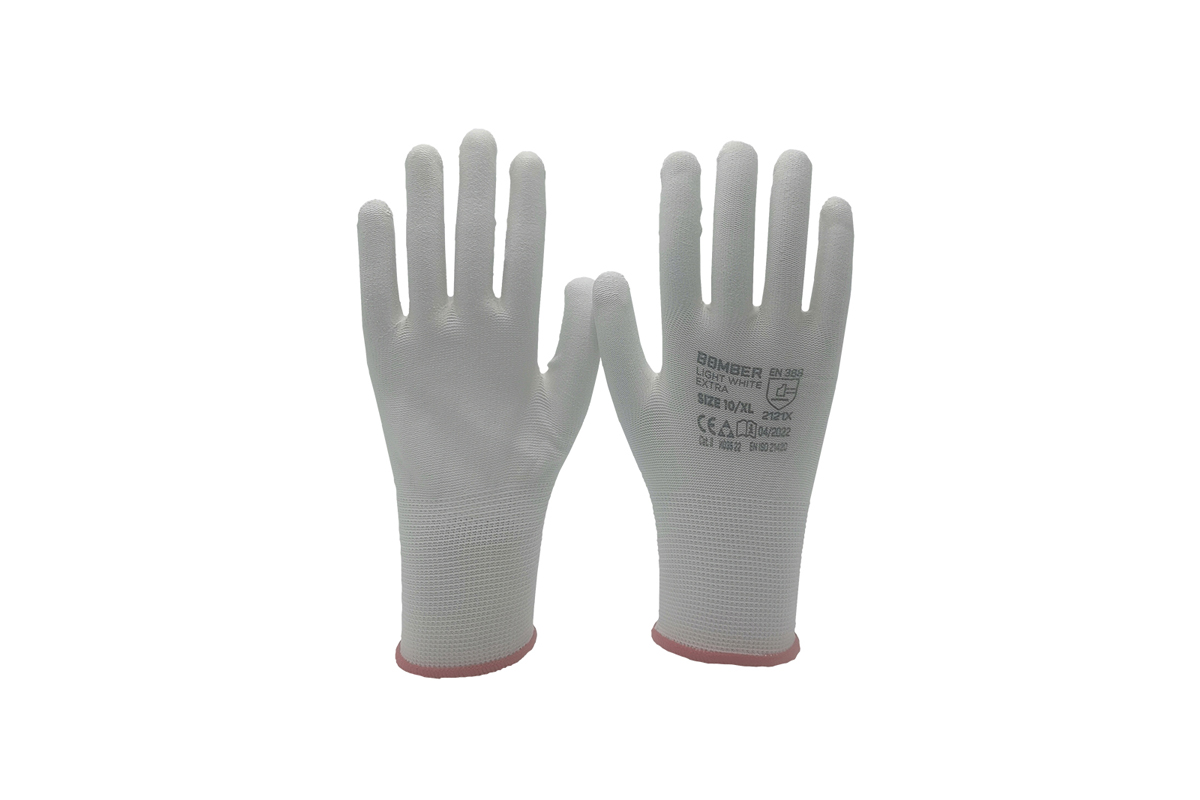 Pletene tanke rukavice od poliestera presvučene na dlanu belim slojem poliuretana. Elastične su i dobro prijanjaju na šake.