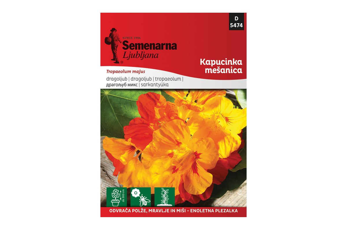 Seme klija za 14-20 dana. Jednogodišnja biljka sa dugim, visećim, bujno cvetnim izdancima koji pokrivaju i zasenjuju pod bašte, ulepšavaju gole betonske zidove, drvene zidove, balkonske ograde. Cvetovi su žuti, narandžasti i crveni. Raste na humusnom, ali ne previše plodnom vlažnom zemljištu i na suncu ili poluseni. Štiti povrće od lisnih vaši i puževa. Vrsta semena: Seme cveća