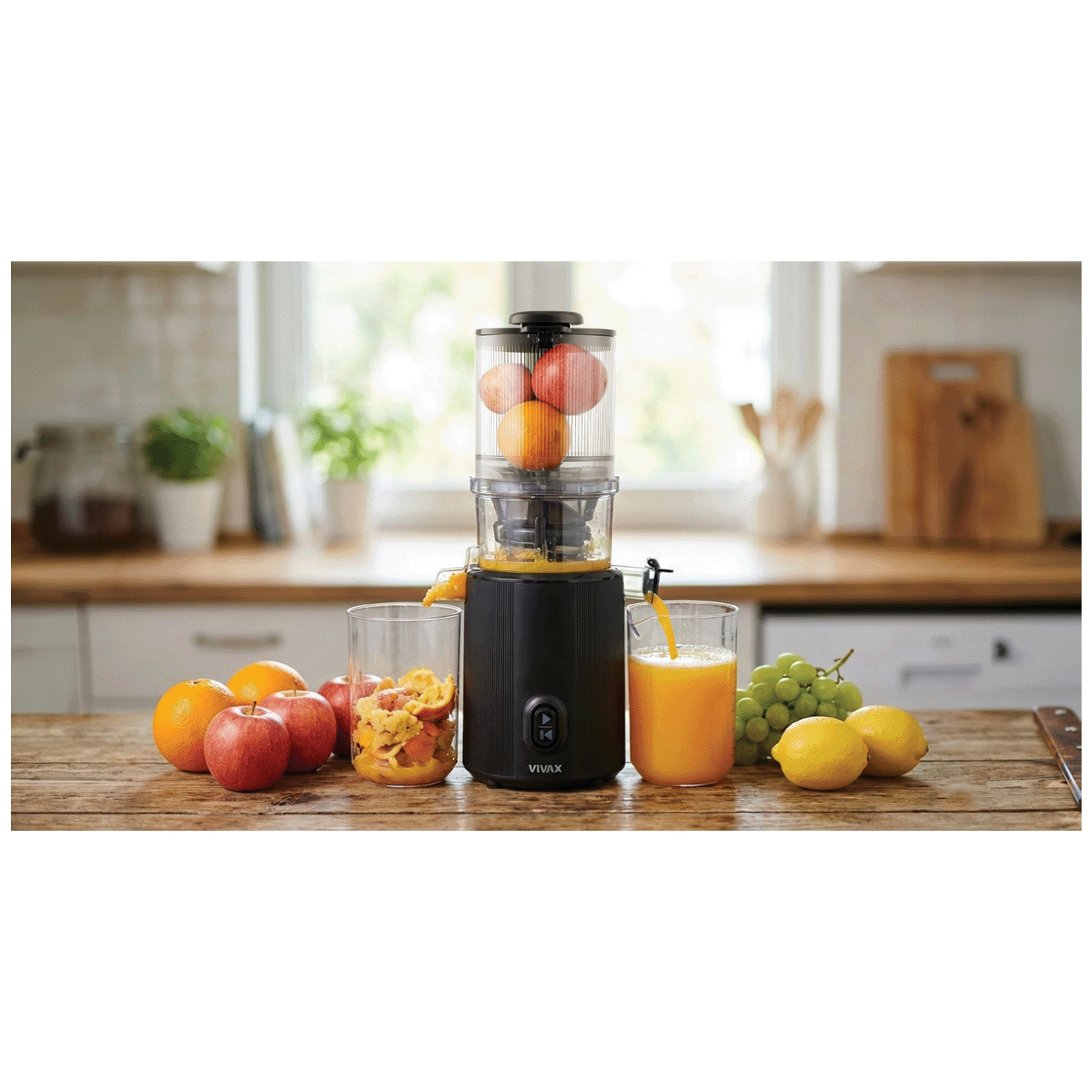 Vivax SJ-300B je Slow juicer sokovnik koji koristi tehnologiju sporog, hladnog prešanja za pripremu svježih i nutritivno bogatih sokova. Za razliku od klasičnih sokovnika, radi na nižim brzinama čime se smanjuje zagrijavanje i oksidacija, pa sok zadržava više vitamina, enzima i prirodnog okusa.